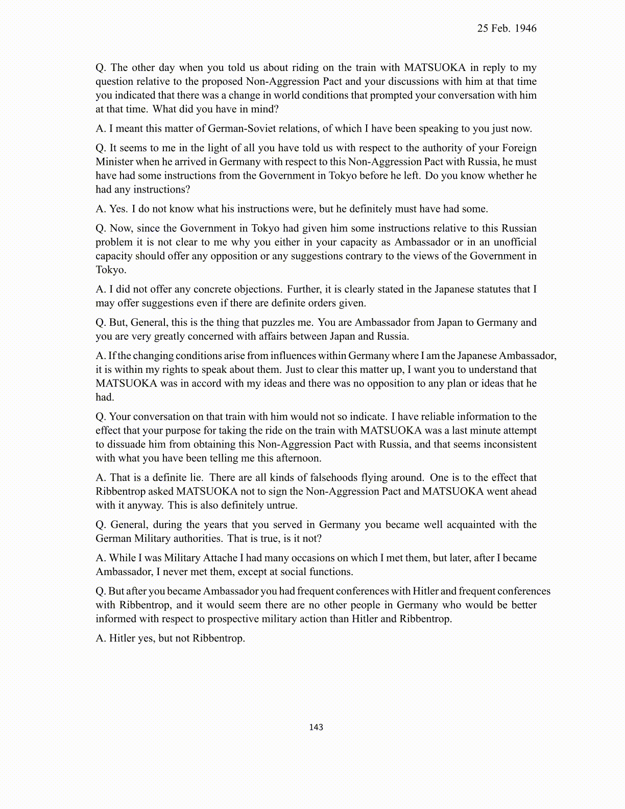 25 Feb. 1946 Q. The other day when you told us about riding on the train with MATSUOKA in reply to my question relative to the proposed Non-Aggression Pact and your discussions with him at that time you indicated that there was a change in world conditions that prompted your conversation with him at that time. What did you have in mind? A. I meant this matter of German-Soviet relations, of which I have been speaking to you just now. Q. It seems to me in the light of all you have told us with respect to the authority of your Foreign Minister when he arrived in Germany with respect to this Non-Aggression Pact with Russia, he must have had some instructions from the Government in Tokyo before he left. Do you know whether he had any instructions? A. Yes. I do not know what his instructions were, but he definitely must have had some. Q. Now, since the Government in Tokyo had given him some instructions relative to this Russian problem it is not clear to me why you either in your capacity as Ambassador or in an unofficial capacity should offer any opposition or any suggestions contrary to the views of the Government in Tokyo. A. I did not offer any concrete objections. Further, it is clearly stated in the Japanese statutes that I may offer suggestions even if there are definite orders given. Q. But, General, this is the thing that puzzles me. You are Ambassador from Japan to Germany and you are very greatly concerned with affairs between Japan and Russia. A. If the changing conditions arise from influences within Germany where I am the Japanese Ambassador, it is within my rights to speak about them. Just to clear this matter up, I want you to understand that MATSUOKA was in accord with my ideas and there was no opposition to any plan or ideas that he had. Q. Your conversation on that train with him would not so indicate. I have reliable information to the effect that your purpose for taking the ride on the train with MATSUOKA was a last minute attempt to dissuade him from obtaining this Non-Aggression Pact with Russia, and that seems inconsistent with what you have been telling me this afternoon. A. That is a definite lie. There are all kinds of falsehoods flying around. One is to the effect that Ribbentrop asked MATSUOKA not to sign the Non-Aggression Pact and MATSUOKA went ahead with it anyway. This is also definitely untrue. Q. General, during the years that you served in Germany you became well acquainted with the German Military authorities. That is true, is it not? A. While I was Military Attache I had many occasions on which I met them, but later, after I became Ambassador, I never met them, except at social functions. Q. But after you became Ambassador you had frequent conferences with Hitler and frequent conferences with Ribbentrop, and it would seem there are no other people in Germany who would be better informed with respect to prospective military action than Hitler and Ribbentrop. A. Hitler yes, but not Ribbentrop. 143