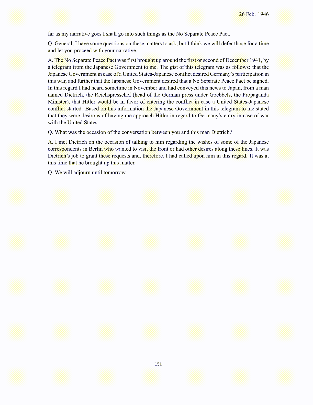26 Feb. 1946 far as my narrative goes I shall go into such things as the No Separate Peace Pact. Q. General, I have some questions on these matters to ask, but I think we will defer those for a time and let you proceed with your narrative. A. The No Separate Peace Pact was first brought up around the first or second of December 1941, by a telegram from the Japanese Government to me. The gist of this telegram was as follows: that the Japanese Government in case of a United States-Japanese conflict desired Germany’s participation in this war, and further that the Japanese Government desired that a No Separate Peace Pact be signed. In this regard I had heard sometime in November and had conveyed this news to Japan, from a man named Dietrich, the Reichspresschef (head of the German press under Goebbels, the Propaganda Minister), that Hitler would be in favor of entering the conflict in case a United States-Japanese conflict started. Based on this information the Japanese Government in this telegram to me stated that they were desirous of having me approach Hitler in regard to Germany’s entry in case of war with the United States. Q. What was the occasion of the conversation between you and this man Dietrich? A. I met Dietrich on the occasion of talking to him regarding the wishes of some of the Japanese correspondents in Berlin who wanted to visit the front or had other desires along these lines. It was Dietrich’s job to grant these requests and, therefore, I had called upon him in this regard. It was at this time that he brought up this matter. Q. We will adjourn until tomorrow. 151