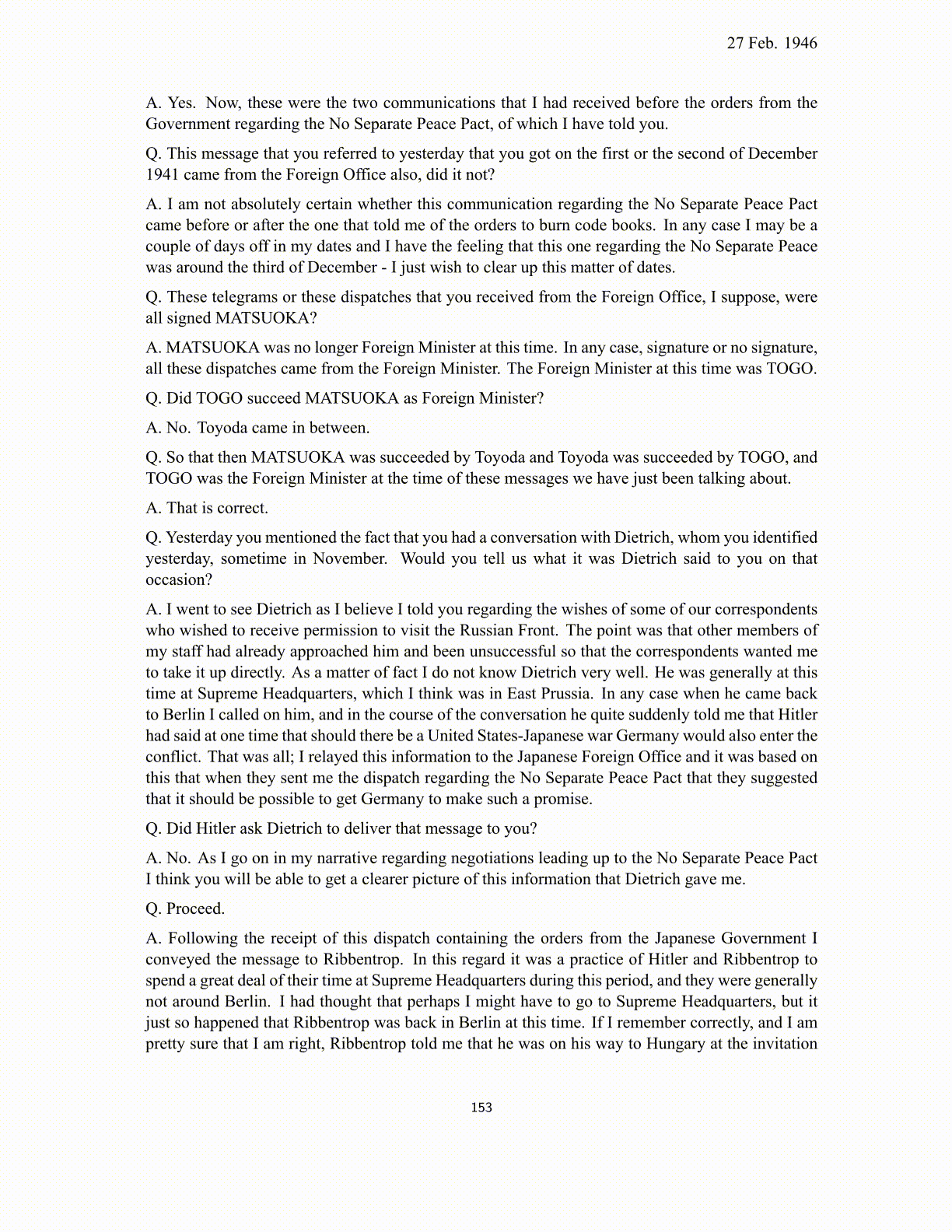 27 Feb. 1946 A. Yes. Now, these were the two communications that I had received before the orders from the Government regarding the No Separate Peace Pact, of which I have told you. Q. This message that you referred to yesterday that you got on the first or the second of December 1941 came from the Foreign Office also, did it not? A. I am not absolutely certain whether this communication regarding the No Separate Peace Pact came before or after the one that told me of the orders to burn code books. In any case I may be a couple of days off in my dates and I have the feeling that this one regarding the No Separate Peace was around the third of December - I just wish to clear up this matter of dates. Q. These telegrams or these dispatches that you received from the Foreign Office, I suppose, were all signed MATSUOKA? A. MATSUOKA was no longer Foreign Minister at this time. In any case, signature or no signature, all these dispatches came from the Foreign Minister. The Foreign Minister at this time was TOGO. Q. Did TOGO succeed MATSUOKA as Foreign Minister? A. No. Toyoda came in between. Q. So that then MATSUOKA was succeeded by Toyoda and Toyoda was succeeded by TOGO, and TOGO was the Foreign Minister at the time of these messages we have just been talking about. A. That is correct. Q. Yesterday you mentioned the fact that you had a conversation with Dietrich, whom you identified yesterday, sometime in November. Would you tell us what it was Dietrich said to you on that occasion? A. I went to see Dietrich as I believe I told you regarding the wishes of some of our correspondents who wished to receive permission to visit the Russian Front. The point was that other members of my staff had already approached him and been unsuccessful so that the correspondents wanted me to take it up directly. As a matter of fact I do not know Dietrich very well. He was generally at this time at Supreme Headquarters, which I think was in East Prussia. In any case when he came back to Berlin I called on him, and in the course of the conversation he quite suddenly told me that Hitler had said at one time that should there be a United States-Japanese war Germany would also enter the conflict. That was all; I relayed this information to the Japanese Foreign Office and it was based on this that when they sent me the dispatch regarding the No Separate Peace Pact that they suggested that it should be possible to get Germany to make such a promise. Q. Did Hitler ask Dietrich to deliver that message to you? A. No. As I go on in my narrative regarding negotiations leading up to the No Separate Peace Pact I think you will be able to get a clearer picture of this information that Dietrich gave me. Q. Proceed. A. Following the receipt of this dispatch containing the orders from the Japanese Government I conveyed the message to Ribbentrop. In this regard it was a practice of Hitler and Ribbentrop to spend a great deal of their time at Supreme Headquarters during this period, and they were generally not around Berlin. I had thought that perhaps I might have to go to Supreme Headquarters, but it just so happened that Ribbentrop was back in Berlin at this time. If I remember correctly, and I am pretty sure that I am right, Ribbentrop told me that he was on his way to Hungary at the invitation 153