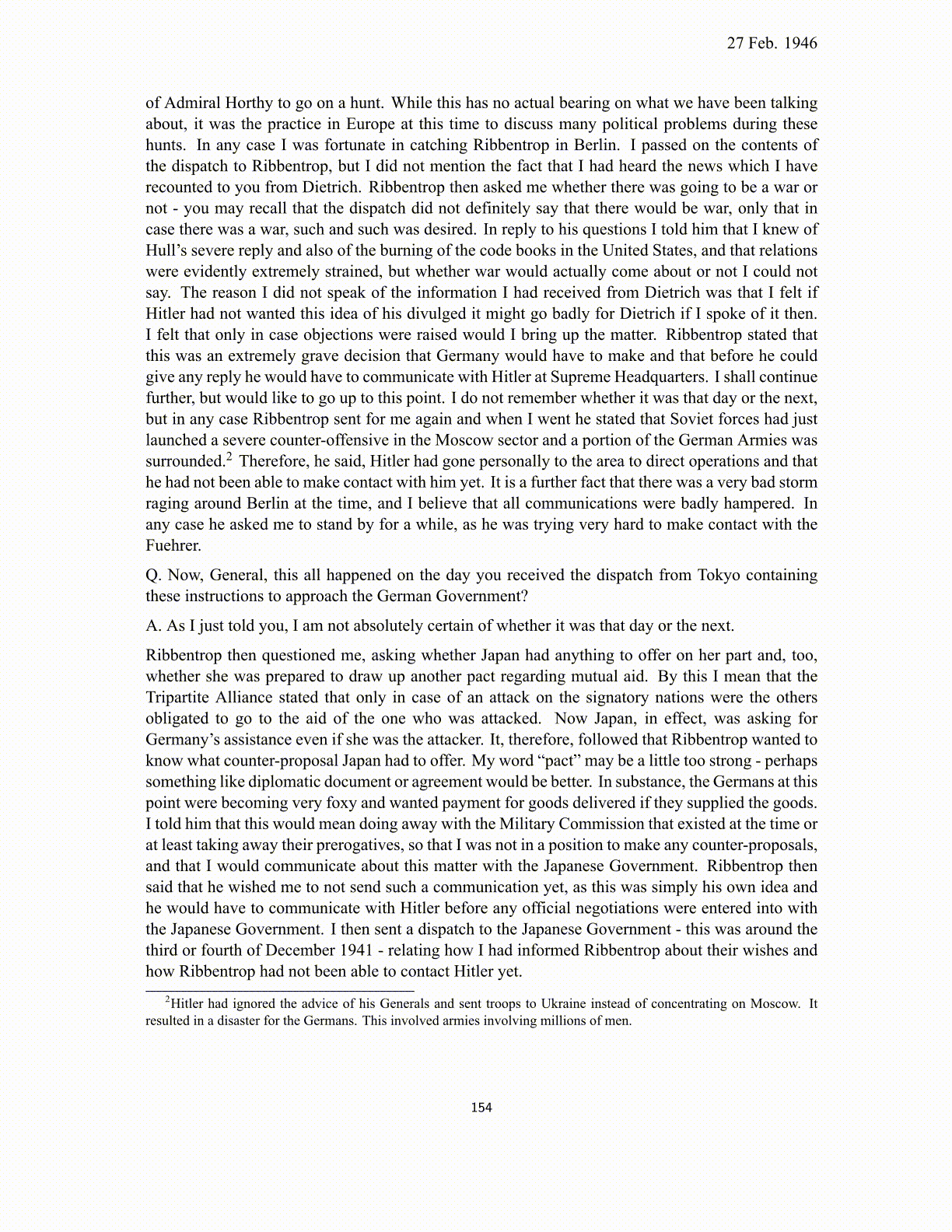 27 Feb. 1946 of Admiral Horthy to go on a hunt. While this has no actual bearing on what we have been talking about, it was the practice in Europe at this time to discuss many political problems during these hunts. In any case I was fortunate in catching Ribbentrop in Berlin. I passed on the contents of the dispatch to Ribbentrop, but I did not mention the fact that I had heard the news which I have recounted to you from Dietrich. Ribbentrop then asked me whether there was going to be a war or not - you may recall that the dispatch did not definitely say that there would be war, only that in case there was a war, such and such was desired. In reply to his questions I told him that I knew of Hull’s severe reply and also of the burning of the code books in the United States, and that relations were evidently extremely strained, but whether war would actually come about or not I could not say. The reason I did not speak of the information I had received from Dietrich was that I felt if Hitler had not wanted this idea of his divulged it might go badly for Dietrich if I spoke of it then. I felt that only in case objections were raised would I bring up the matter. Ribbentrop stated that this was an extremely grave decision that Germany would have to make and that before he could give any reply he would have to communicate with Hitler at Supreme Headquarters. I shall continue further, but would like to go up to this point. I do not remember whether it was that day or the next, but in any case Ribbentrop sent for me again and when I went he stated that Soviet forces had just launched a severe counter-offensive in the Moscow sector and a portion of the German Armies was surrounded. 2 Therefore, he said, Hitler had gone personally to the area to direct operations and that he had not been able to make contact with him yet. It is a further fact that there was a very bad storm raging around Berlin at the time, and I believe that all communications were badly hampered. In any case he asked me to stand by for a while, as he was trying very hard to make contact with the Fuehrer. Q. Now, General, this all happened on the day you received the dispatch from Tokyo containing these instructions to approach the German Government? A. As I just told you, I am not absolutely certain of whether it was that day or the next. Ribbentrop then questioned me, asking whether Japan had anything to offer on her part and, too, whether she was prepared to draw up another pact regarding mutual aid. By this I mean that the Tripartite Alliance stated that only in case of an attack on the signatory nations were the others obligated to go to the aid of the one who was attacked. Now Japan, in effect, was asking for Germany’s assistance even if she was the attacker. It, therefore, followed that Ribbentrop wanted to know what counter-proposal Japan had to offer. My word “pact” may be a little too strong - perhaps something like diplomatic document or agreement would be better. In substance, the Germans at this point were becoming very foxy and wanted payment for goods delivered if they supplied the goods. I told him that this would mean doing away with the Military Commission that existed at the time or at least taking away their prerogatives, so that I was not in a position to make any counter-proposals, and that I would communicate about this matter with the Japanese Government. Ribbentrop then said that he wished me to not send such a communication yet, as this was simply his own idea and he would have to communicate with Hitler before any official negotiations were entered into with the Japanese Government. I then sent a dispatch to the Japanese Government - this was around the third or fourth of December 1941 - relating how I had informed Ribbentrop about their wishes and how Ribbentrop had not been able to contact Hitler yet. 2 Hitler had ignored the advice of his Generals and sent troops to Ukraine instead of concentrating on Moscow. It resulted in a disaster for the Germans. This involved armies involving millions of men. 154