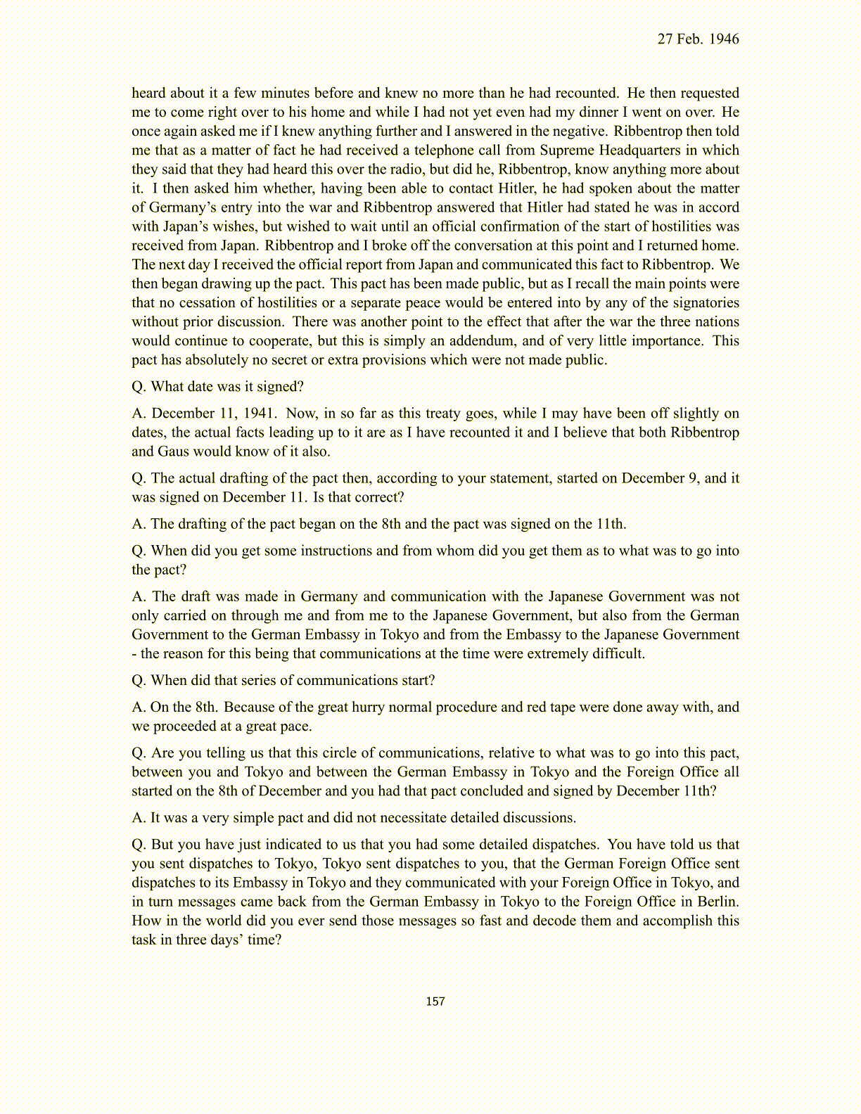 27 Feb. 1946 heard about it a few minutes before and knew no more than he had recounted. He then requested me to come right over to his home and while I had not yet even had my dinner I went on over. He once again asked me if I knew anything further and I answered in the negative. Ribbentrop then told me that as a matter of fact he had received a telephone call from Supreme Headquarters in which they said that they had heard this over the radio, but did he, Ribbentrop, know anything more about it. I then asked him whether, having been able to contact Hitler, he had spoken about the matter of Germany’s entry into the war and Ribbentrop answered that Hitler had stated he was in accord with Japan’s wishes, but wished to wait until an official confirmation of the start of hostilities was received from Japan. Ribbentrop and I broke off the conversation at this point and I returned home. The next day I received the official report from Japan and communicated this fact to Ribbentrop. We then began drawing up the pact. This pact has been made public, but as I recall the main points were that no cessation of hostilities or a separate peace would be entered into by any of the signatories without prior discussion. There was another point to the effect that after the war the three nations would continue to cooperate, but this is simply an addendum, and of very little importance. This pact has absolutely no secret or extra provisions which were not made public. Q. What date was it signed? A. December 11, 1941. Now, in so far as this treaty goes, while I may have been off slightly on dates, the actual facts leading up to it are as I have recounted it and I believe that both Ribbentrop and Gaus would know of it also. Q. The actual drafting of the pact then, according to your statement, started on December 9, and it was signed on December 11. Is that correct? A. The drafting of the pact began on the 8th and the pact was signed on the 11th. Q. When did you get some instructions and from whom did you get them as to what was to go into the pact? A. The draft was made in Germany and communication with the Japanese Government was not only carried on through me and from me to the Japanese Government, but also from the German Government to the German Embassy in Tokyo and from the Embassy to the Japanese Government - the reason for this being that communications at the time were extremely difficult. Q. When did that series of communications start? A. On the 8th. Because of the great hurry normal procedure and red tape were done away with, and we proceeded at a great pace. Q. Are you telling us that this circle of communications, relative to what was to go into this pact, between you and Tokyo and between the German Embassy in Tokyo and the Foreign Office all started on the 8th of December and you had that pact concluded and signed by December 11th? A. It was a very simple pact and did not necessitate detailed discussions. Q. But you have just indicated to us that you had some detailed dispatches. You have told us that you sent dispatches to Tokyo, Tokyo sent dispatches to you, that the German Foreign Office sent dispatches to its Embassy in Tokyo and they communicated with your Foreign Office in Tokyo, and in turn messages came back from the German Embassy in Tokyo to the Foreign Office in Berlin. How in the world did you ever send those messages so fast and decode them and accomplish this task in three days’ time? 157