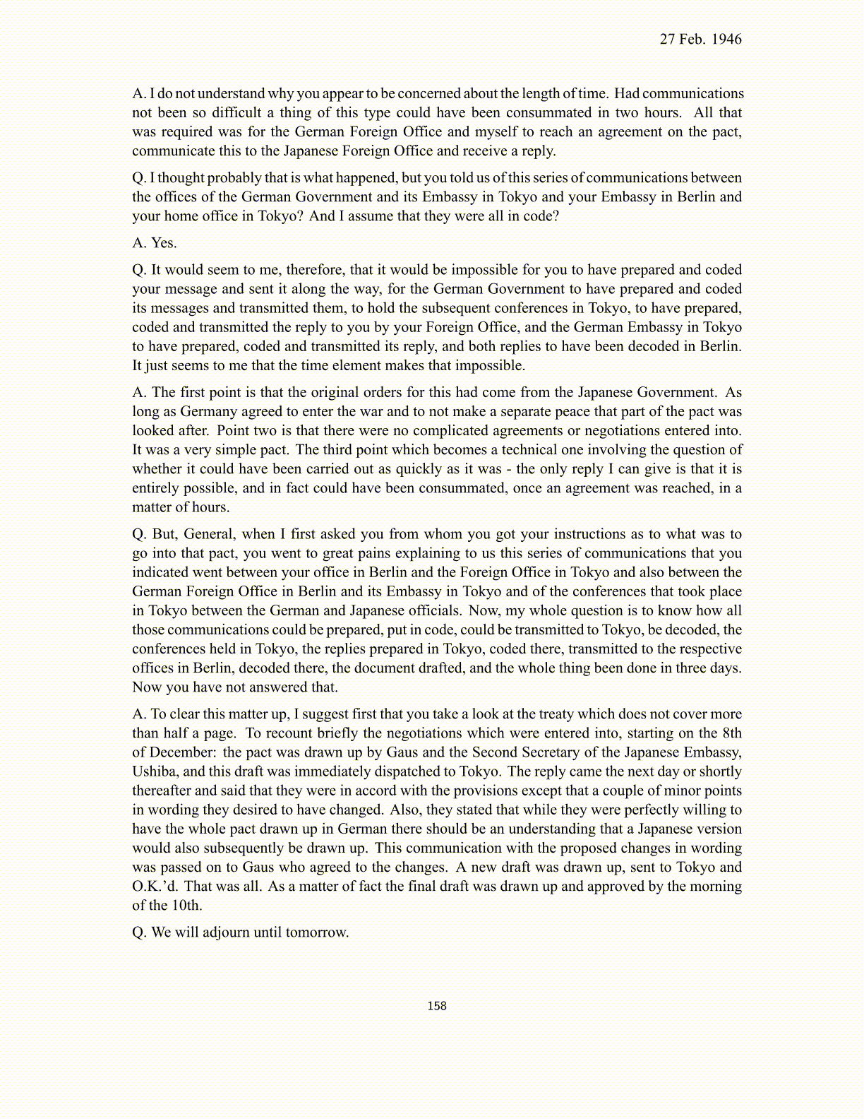 27 Feb. 1946 A. I do not understand why you appear to be concerned about the length of time. Had communications not been so difficult a thing of this type could have been consummated in two hours. All that was required was for the German Foreign Office and myself to reach an agreement on the pact, communicate this to the Japanese Foreign Office and receive a reply. Q. I thought probably that is what happened, but you told us of this series of communications between the offices of the German Government and its Embassy in Tokyo and your Embassy in Berlin and your home office in Tokyo? And I assume that they were all in code? A. Yes. Q. It would seem to me, therefore, that it would be impossible for you to have prepared and coded your message and sent it along the way, for the German Government to have prepared and coded its messages and transmitted them, to hold the subsequent conferences in Tokyo, to have prepared, coded and transmitted the reply to you by your Foreign Office, and the German Embassy in Tokyo to have prepared, coded and transmitted its reply, and both replies to have been decoded in Berlin. It just seems to me that the time element makes that impossible. A. The first point is that the original orders for this had come from the Japanese Government. As long as Germany agreed to enter the war and to not make a separate peace that part of the pact was looked after. Point two is that there were no complicated agreements or negotiations entered into. It was a very simple pact. The third point which becomes a technical one involving the question of whether it could have been carried out as quickly as it was - the only reply I can give is that it is entirely possible, and in fact could have been consummated, once an agreement was reached, in a matter of hours. Q. But, General, when I first asked you from whom you got your instructions as to what was to go into that pact, you went to great pains explaining to us this series of communications that you indicated went between your office in Berlin and the Foreign Office in Tokyo and also between the German Foreign Office in Berlin and its Embassy in Tokyo and of the conferences that took place in Tokyo between the German and Japanese officials. Now, my whole question is to know how all those communications could be prepared, put in code, could be transmitted to Tokyo, be decoded, the conferences held in Tokyo, the replies prepared in Tokyo, coded there, transmitted to the respective offices in Berlin, decoded there, the document drafted, and the whole thing been done in three days. Now you have not answered that. A. To clear this matter up, I suggest first that you take a look at the treaty which does not cover more than half a page. To recount briefly the negotiations which were entered into, starting on the 8th of December: the pact was drawn up by Gaus and the Second Secretary of the Japanese Embassy, Ushiba, and this draft was immediately dispatched to Tokyo. The reply came the next day or shortly thereafter and said that they were in accord with the provisions except that a couple of minor points in wording they desired to have changed. Also, they stated that while they were perfectly willing to have the whole pact drawn up in German there should be an understanding that a Japanese version would also subsequently be drawn up. This communication with the proposed changes in wording was passed on to Gaus who agreed to the changes. A new draft was drawn up, sent to Tokyo and O.K.’d. That was all. As a matter of fact the final draft was drawn up and approved by the morning of the 10th. Q. We will adjourn until tomorrow. 158