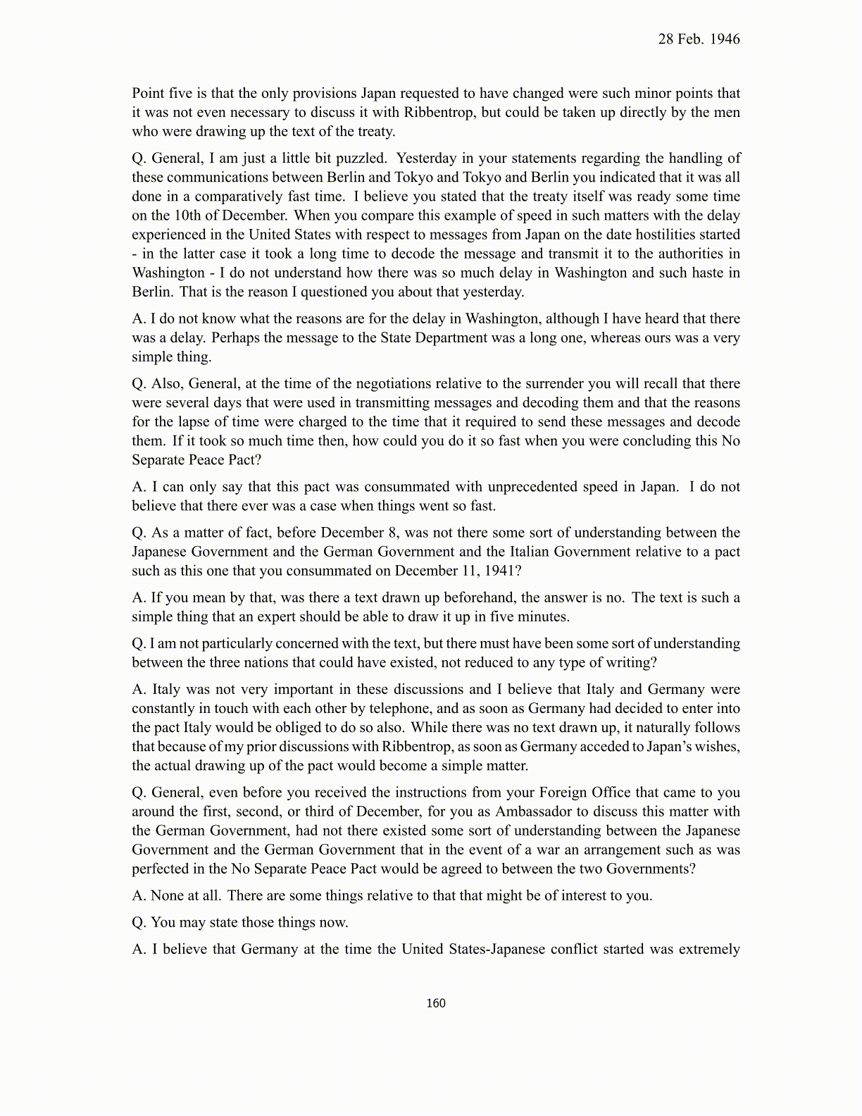 28 Feb. 1946 Point five is that the only provisions Japan requested to have changed were such minor points that it was not even necessary to discuss it with Ribbentrop, but could be taken up directly by the men who were drawing up the text of the treaty. Q. General, I am just a little bit puzzled. Yesterday in your statements regarding the handling of these communications between Berlin and Tokyo and Tokyo and Berlin you indicated that it was all done in a comparatively fast time. I believe you stated that the treaty itself was ready some time on the 10th of December. When you compare this example of speed in such matters with the delay experienced in the United States with respect to messages from Japan on the date hostilities started - in the latter case it took a long time to decode the message and transmit it to the authorities in Washington - I do not understand how there was so much delay in Washington and such haste in Berlin. That is the reason I questioned you about that yesterday. A. I do not know what the reasons are for the delay in Washington, although I have heard that there was a delay. Perhaps the message to the State Department was a long one, whereas ours was a very simple thing. Q. Also, General, at the time of the negotiations relative to the surrender you will recall that there were several days that were used in transmitting messages and decoding them and that the reasons for the lapse of time were charged to the time that it required to send these messages and decode them. If it took so much time then, how could you do it so fast when you were concluding this No Separate Peace Pact? A. I can only say that this pact was consummated with unprecedented speed in Japan. I do not believe that there ever was a case when things went so fast. Q. As a matter of fact, before December 8, was not there some sort of understanding between the Japanese Government and the German Government and the Italian Government relative to a pact such as this one that you consummated on December 11, 1941? A. If you mean by that, was there a text drawn up beforehand, the answer is no. The text is such a simple thing that an expert should be able to draw it up in five minutes. Q. I am not particularly concerned with the text, but there must have been some sort of understanding between the three nations that could have existed, not reduced to any type of writing? A. Italy was not very important in these discussions and I believe that Italy and Germany were constantly in touch with each other by telephone, and as soon as Germany had decided to enter into the pact Italy would be obliged to do so also. While there was no text drawn up, it naturally follows that because of my prior discussions with Ribbentrop, as soon as Germany acceded to Japan’s wishes, the actual drawing up of the pact would become a simple matter. Q. General, even before you received the instructions from your Foreign Office that came to you around the first, second, or third of December, for you as Ambassador to discuss this matter with the German Government, had not there existed some sort of understanding between the Japanese Government and the German Government that in the event of a war an arrangement such as was perfected in the No Separate Peace Pact would be agreed to between the two Governments? A. None at all. There are some things relative to that that might be of interest to you. Q. You may state those things now. A. I believe that Germany at the time the United States-Japanese conflict started was extremely 160