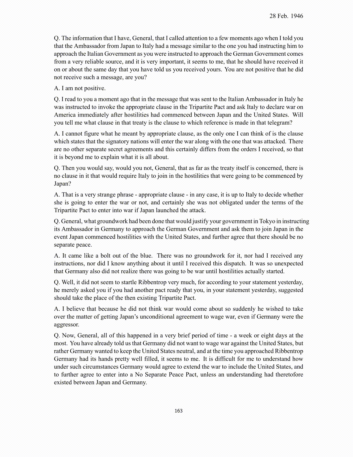 28 Feb. 1946 Q. The information that I have, General, that I called attention to a few moments ago when I told you that the Ambassador from Japan to Italy had a message similar to the one you had instructing him to approach the Italian Government as you were instructed to approach the German Government comes from a very reliable source, and it is very important, it seems to me, that he should have received it on or about the same day that you have told us you received yours. You are not positive that he did not receive such a message, are you? A. I am not positive. Q. I read to you a moment ago that in the message that was sent to the Italian Ambassador in Italy he was instructed to invoke the appropriate clause in the Tripartite Pact and ask Italy to declare war on America immediately after hostilities had commenced between Japan and the United States. Will you tell me what clause in that treaty is the clause to which reference is made in that telegram? A. I cannot figure what he meant by appropriate clause, as the only one I can think of is the clause which states that the signatory nations will enter the war along with the one that was attacked. There are no other separate secret agreements and this certainly differs from the orders I received, so that it is beyond me to explain what it is all about. Q. Then you would say, would you not, General, that as far as the treaty itself is concerned, there is no clause in it that would require Italy to join in the hostilities that were going to be commenced by Japan? A. That is a very strange phrase - appropriate clause - in any case, it is up to Italy to decide whether she is going to enter the war or not, and certainly she was not obligated under the terms of the Tripartite Pact to enter into war if Japan launched the attack. Q. General, what groundwork had been done that would justify your government in Tokyo in instructing its Ambassador in Germany to approach the German Government and ask them to join Japan in the event Japan commenced hostilities with the United States, and further agree that there should be no separate peace. A. It came like a bolt out of the blue. There was no groundwork for it, nor had I received any instructions, nor did I know anything about it until I received this dispatch. It was so unexpected that Germany also did not realize there was going to be war until hostilities actually started. Q. Well, it did not seem to startle Ribbentrop very much, for according to your statement yesterday, he merely asked you if you had another pact ready that you, in your statement yesterday, suggested should take the place of the then existing Tripartite Pact. A. I believe that because he did not think war would come about so suddenly he wished to take over the matter of getting Japan’s unconditional agreement to wage war, even if Germany were the aggressor. Q. Now, General, all of this happened in a very brief period of time - a week or eight days at the most. You have already told us that Germany did not want to wage war against the United States, but rather Germany wanted to keep the United States neutral, and at the time you approached Ribbentrop Germany had its hands pretty well filled, it seems to me. It is difficult for me to understand how under such circumstances Germany would agree to extend the war to include the United States, and to further agree to enter into a No Separate Peace Pact, unless an understanding had theretofore existed between Japan and Germany. 163