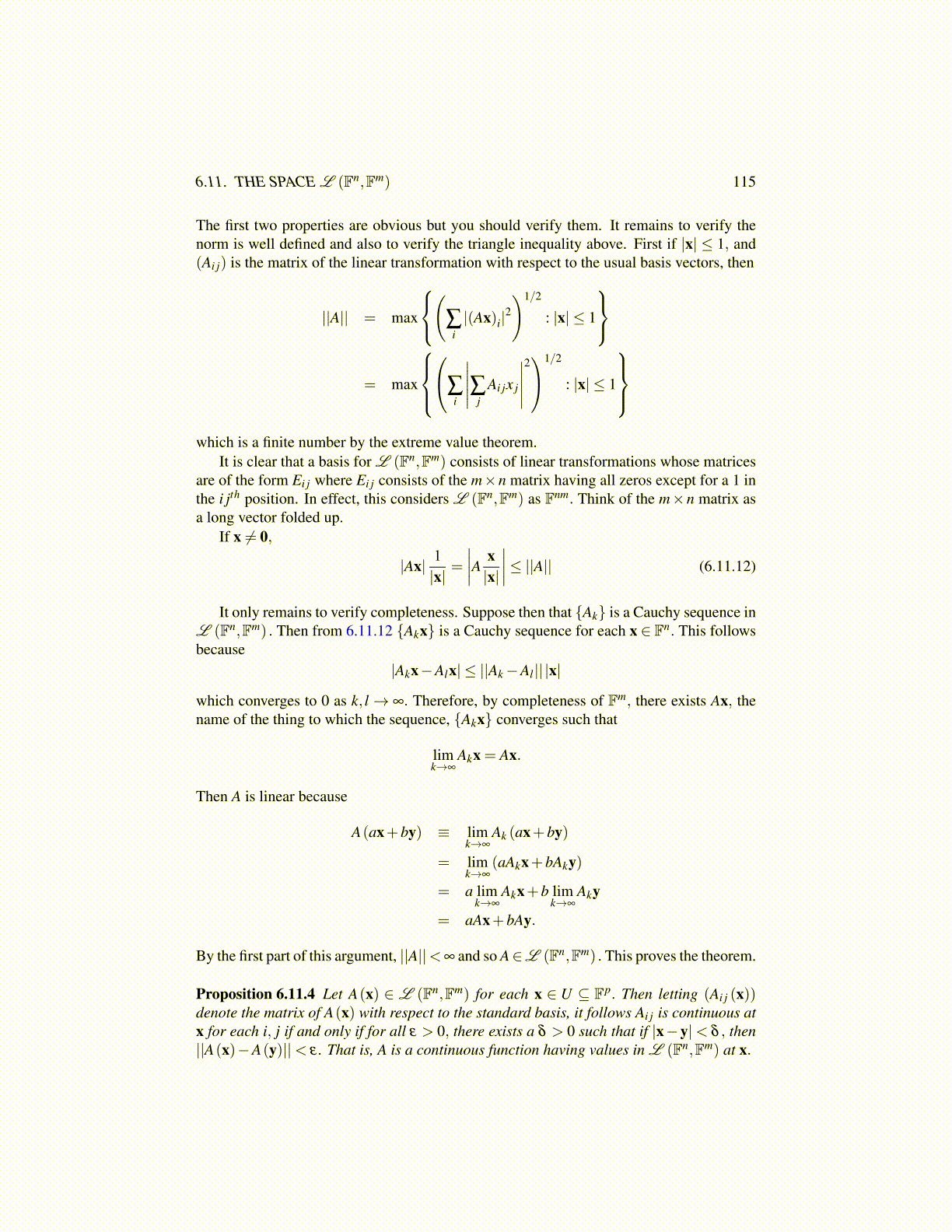 Proposition 6.11.4 Let A(x) ∈ L (Fn,Fm) for each x ∈ U ⊆ Fp. Then letting (Ai j (x))denote the matrix of A(x) with respect to the standard basis, it follows Ai j is continuous atx for each i, j if and only if for all ε > 0, there exists a δ > 0 such that if |x−y|< δ , then||A(x)−A(y)||< ε . That is, A is a continuous function having values in L (Fn,Fm) at x.