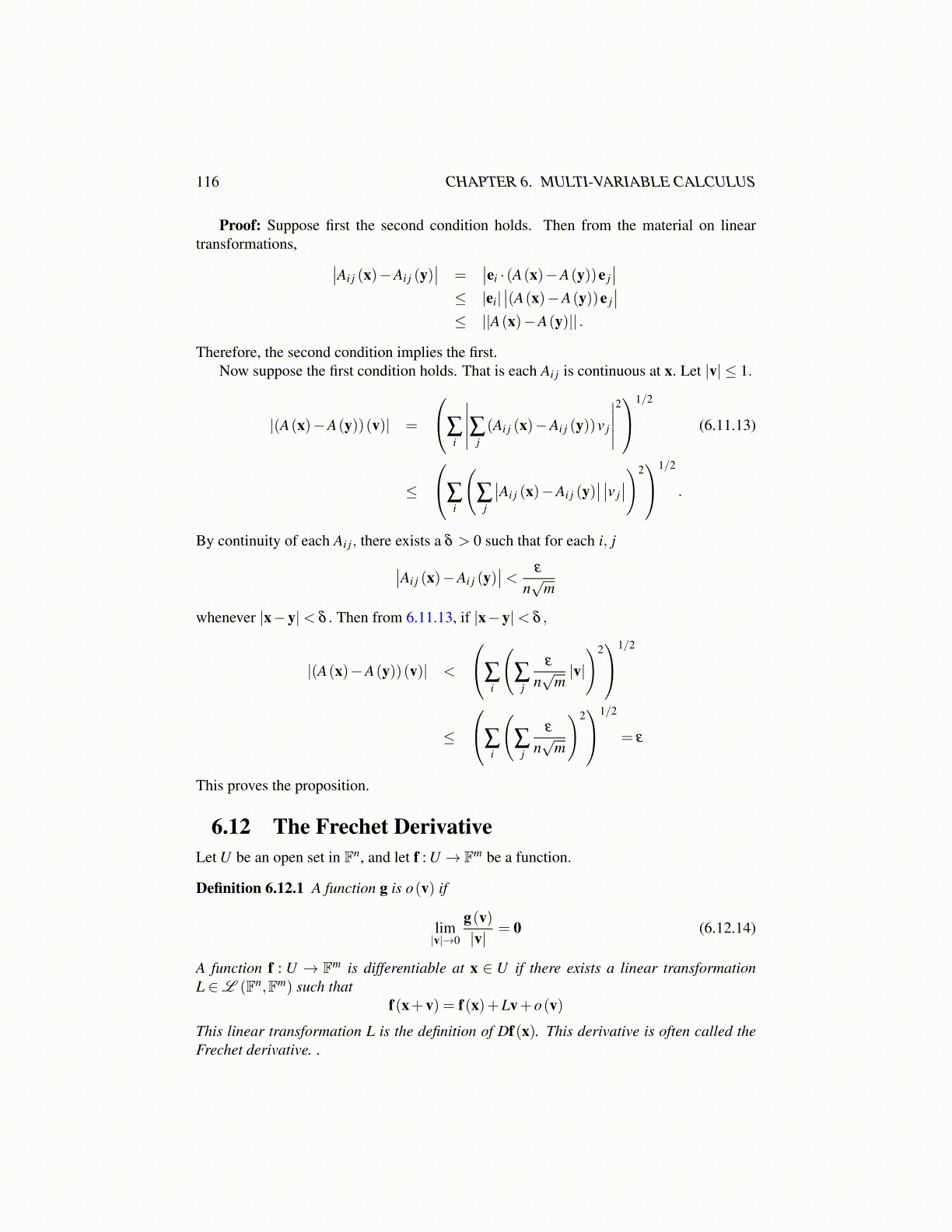 Therefore, the second condition implies the first.Now suppose the first condition holds. That is each Ai j is continuous at x. Let |v| ≤ 1.