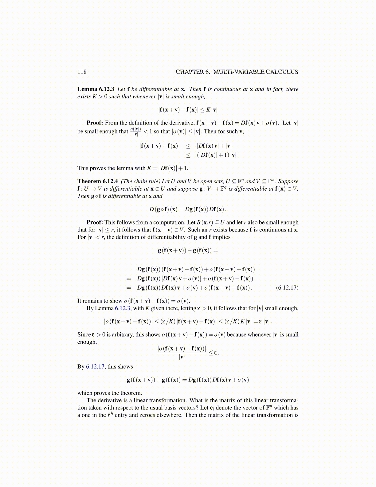 Lemma 6.12.3 Let f be differentiable at x. Then f is continuous at x and in fact, thereexists K > 0 such that whenever |v| is small enough,
