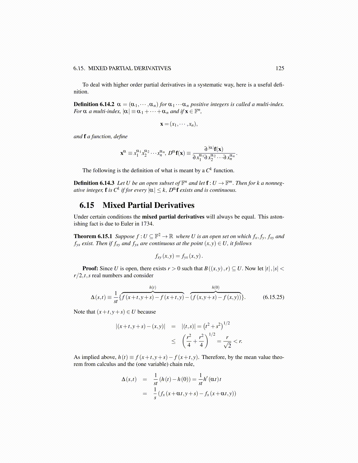 Theorem 6.15.1 Suppose f : U ⊆ F2→R where U is an open set on which fx, fy, fxy andfyx exist. Then if fxy and fyx are continuous at the point (x,y) ∈U, it follows