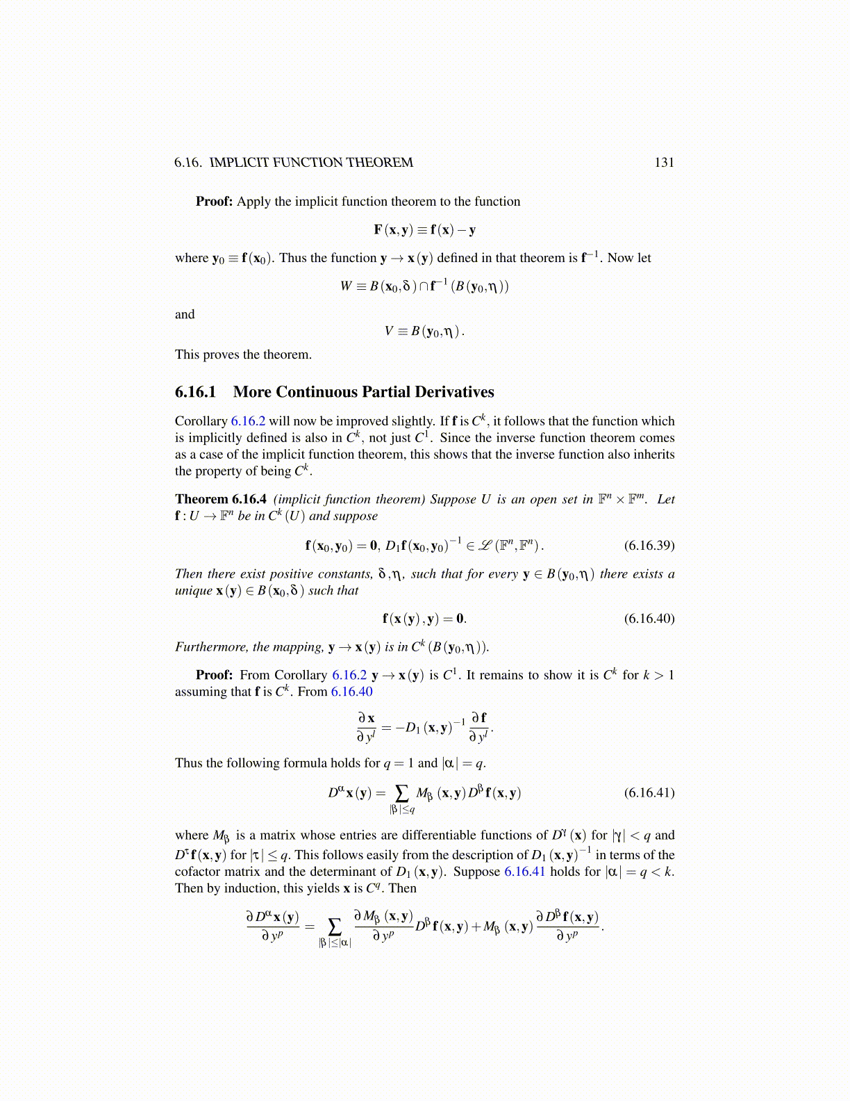 where Mβ is a matrix whose entries are differentiable functions of Dγ (x) for |γ| < q andDτ f(x,y) for |τ| ≤ q. This follows easily from the description of D1 (x,y)−1 in terms of thecofactor matrix and the determinant of D1 (x,y). Suppose 6.16.41 holds for |α| = q < k.Then by induction, this yields x is Cq. Then