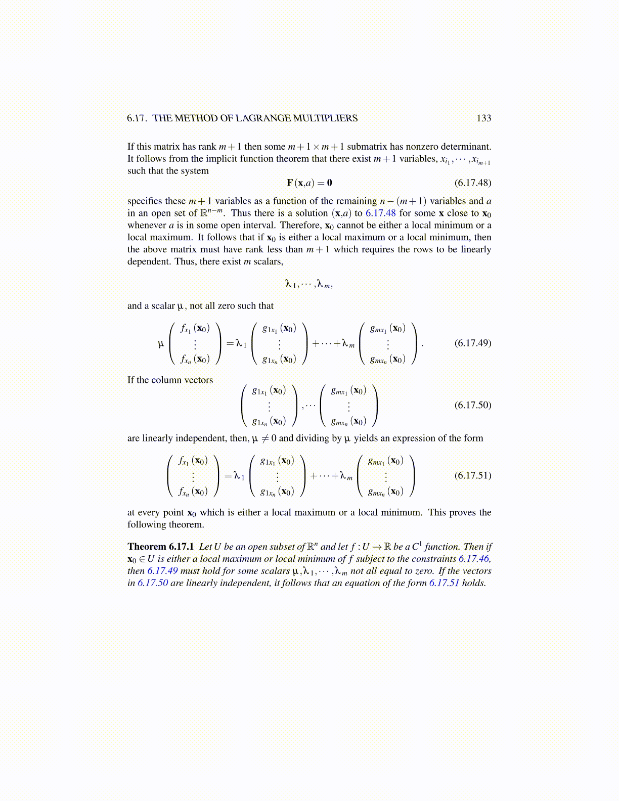 Theorem 6.17.1 Let U be an open subset ofRn and let f : U→R be a C1 function. Then ifx0 ∈U is either a local maximum or local minimum of f subject to the constraints 6.17.46,then 6.17.49 must hold for some scalars µ,λ 1, · · · ,λ m not all equal to zero. If the vectorsin 6.17.50 are linearly independent, it follows that an equation of the form 6.17.51 holds.