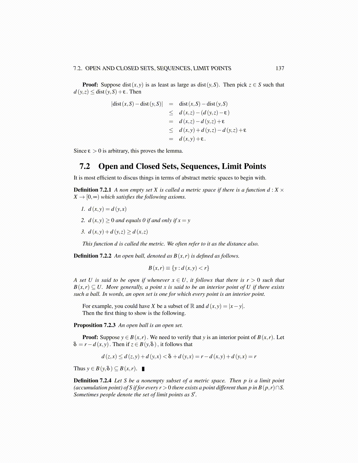 7.2 Open and Closed Sets, Sequences, Limit PointsIt is most efficient to discus things in terms of abstract metric spaces to begin with.