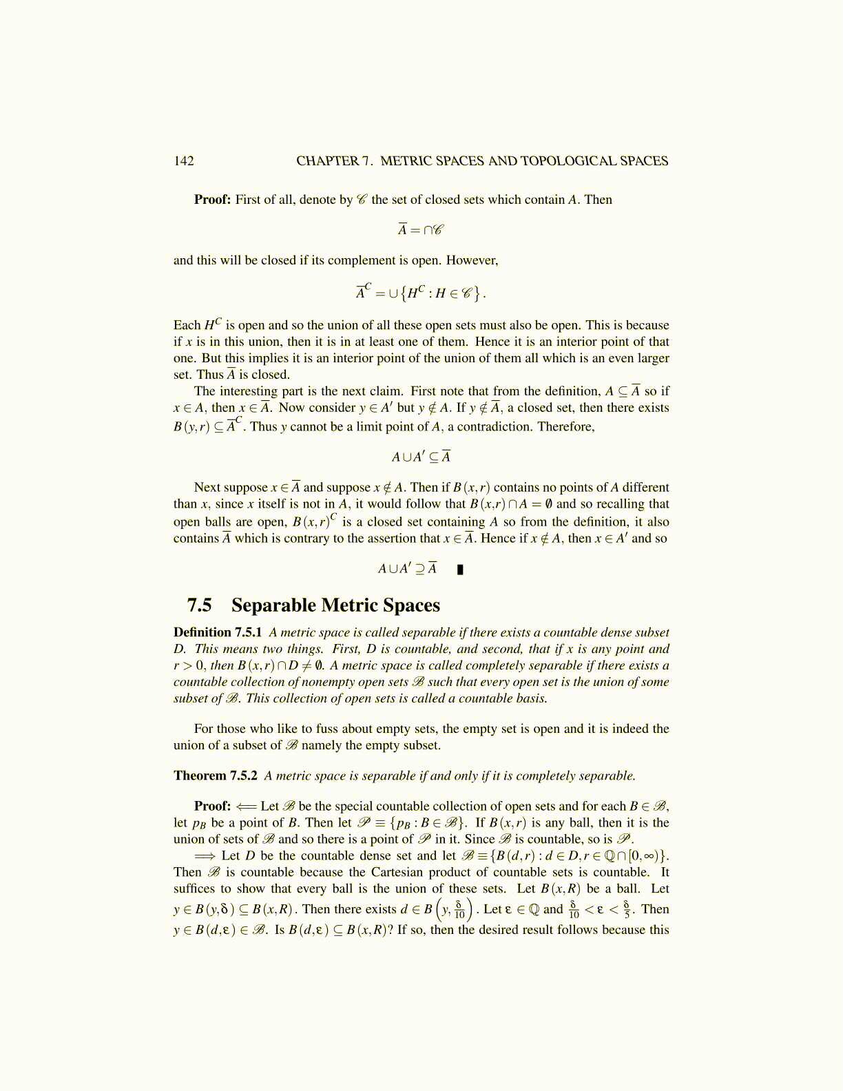 7.5 Separable Metric SpacesDefinition 7.5.1 A metric space is called separable if there exists a countable dense subsetD. This means two things. First, D is countable, and second, that if x is any point andr > 0, then B(x,r)∩D ̸= /0. A metric space is called completely separable if there exists acountable collection of nonempty open sets B such that every open set is the union of somesubset of B. This collection of open sets is called a countable basis.