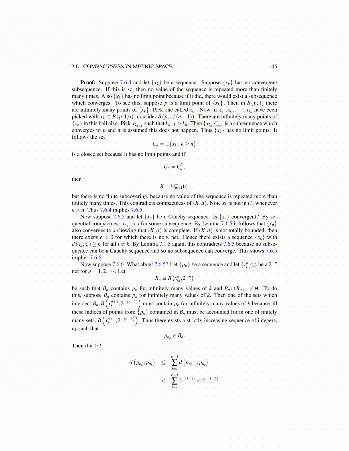 Now suppose 7.6.5 and let {xn} be a Cauchy sequence. Is {xn} convergent? By se-quential compactness xnk → x for some subsequence. By Lemma 7.1.5 it follows that {xn}also converges to x showing that (X ,d) is complete. If (X ,d) is not totally bounded, thenthere exists ε > 0 for which there is no ε net. Hence there exists a sequence {xk} withd (xk,xl)≥ ε for all l ̸= k. By Lemma 7.1.5 again, this contradicts 7.6.5 because no subse-quence can be a Cauchy sequence and so no subsequence can converge. This shows 7.6.5implies 7.6.6.
