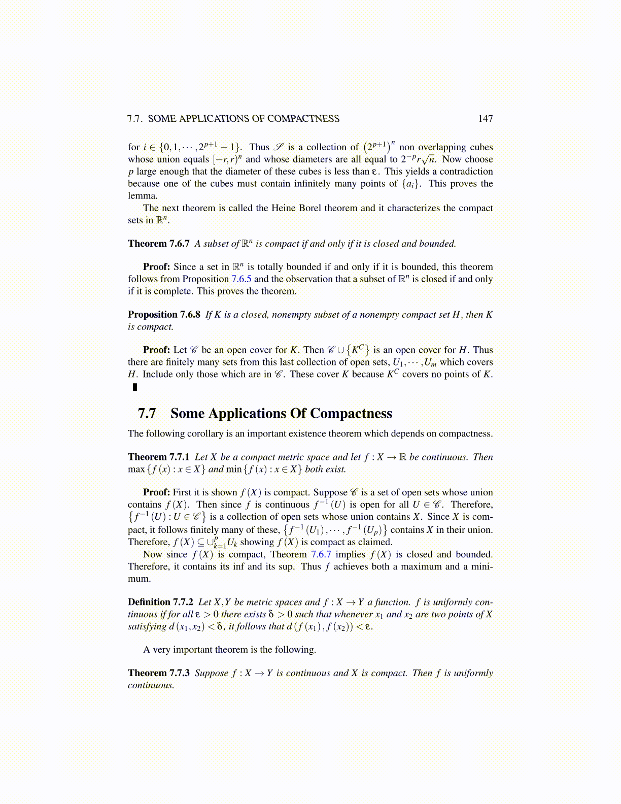 Theorem 7.7.1 Let X be a compact metric space and let f : X → R be continuous. Thenmax{ f (x) : x ∈ X} and min{ f (x) : x ∈ X} both exist.