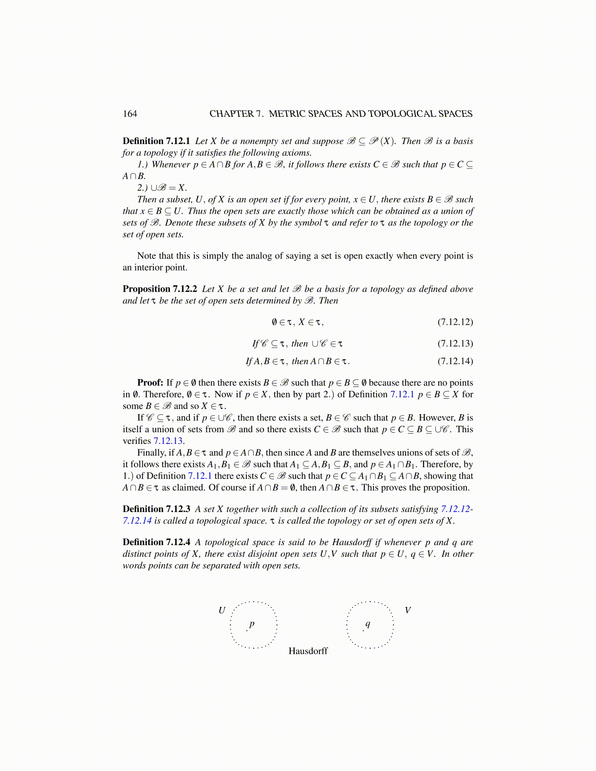 Definition 7.12.4 A topological space is said to be Hausdorff if whenever p and q aredistinct points of X, there exist disjoint open sets U,V such that p ∈U, q ∈ V . In otherwords points can be separated with open sets.