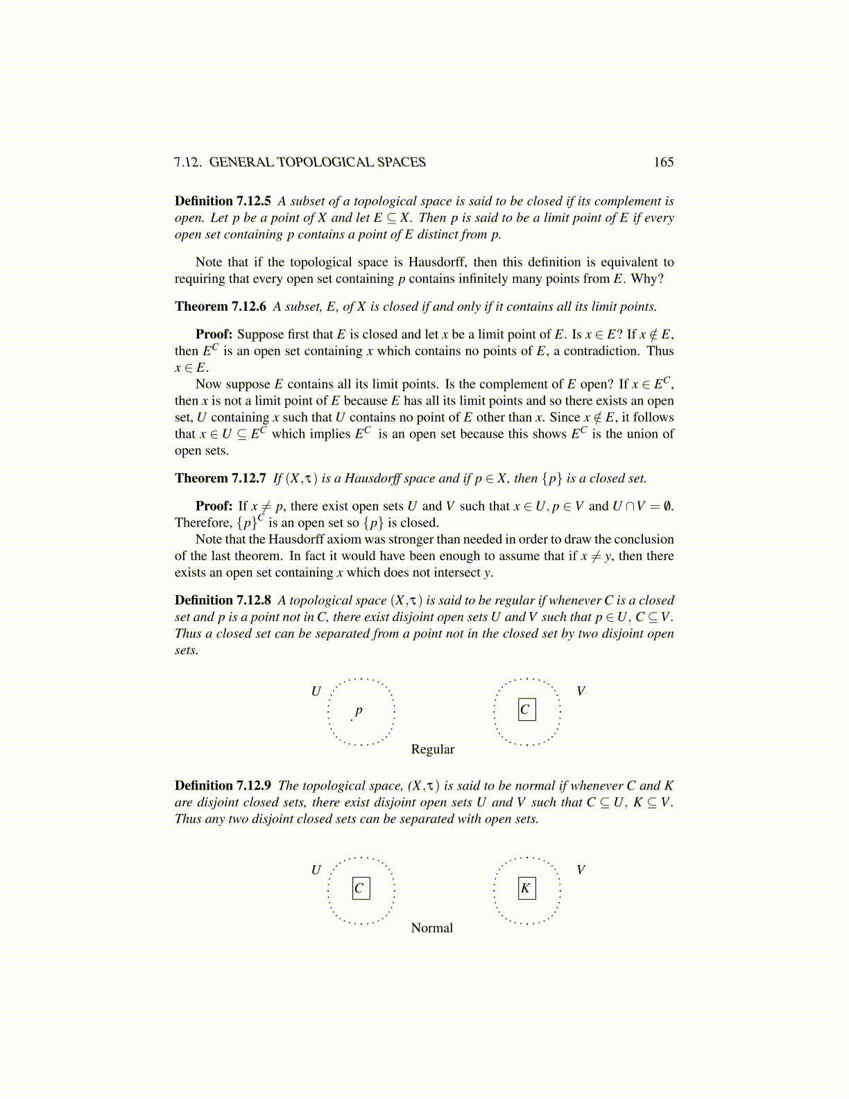 Definition 7.12.8 A topological space (X ,τ) is said to be regular if whenever C is a closedset and p is a point not in C, there exist disjoint open sets U and V such that p ∈U, C⊆V .Thus a closed set can be separated from a point not in the closed set by two disjoint opensets.