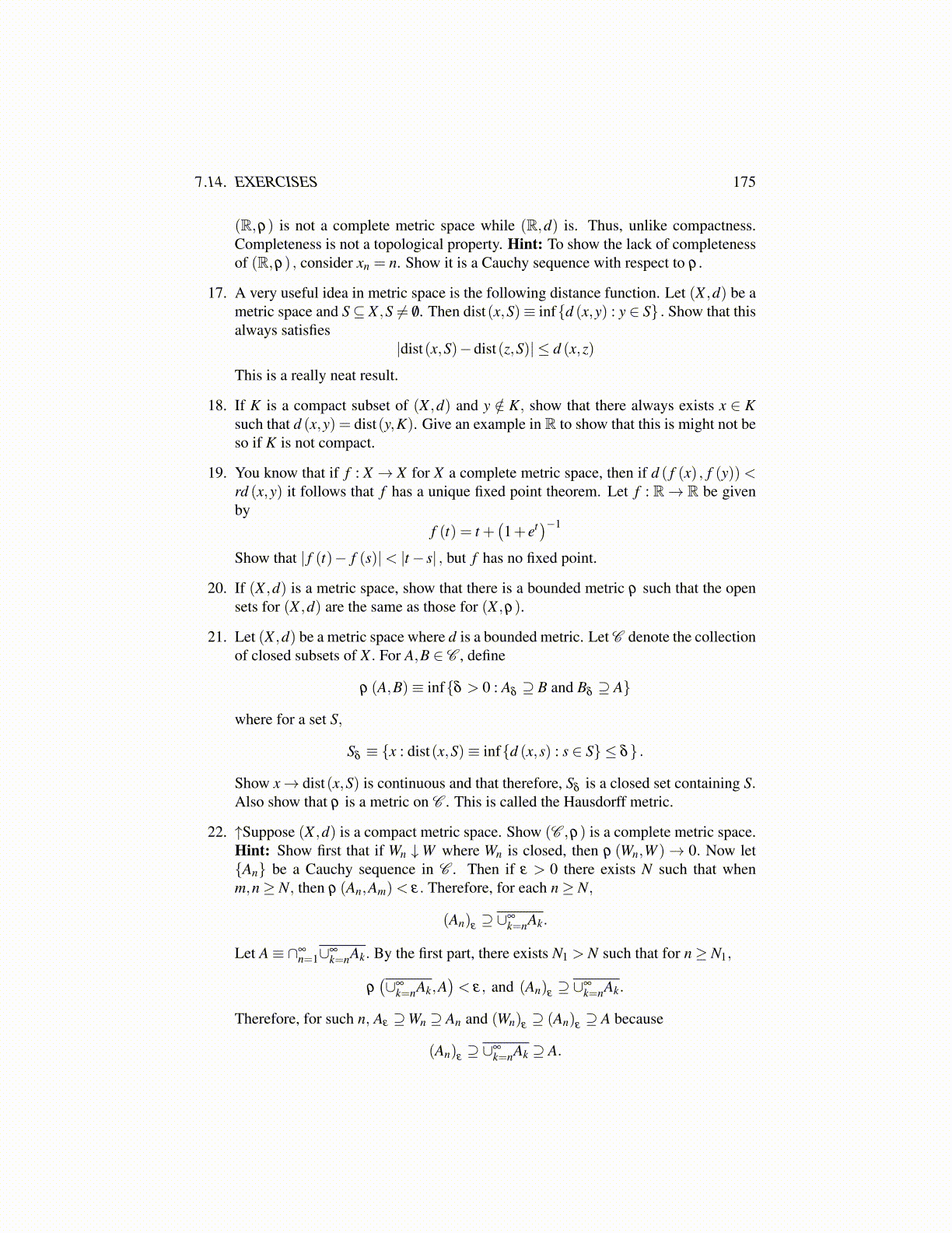 22. ↑Suppose (X ,d) is a compact metric space. Show (C ,ρ) is a complete metric space.Hint: Show first that if Wn ↓W where Wn is closed, then ρ (Wn,W )→ 0. Now let{An} be a Cauchy sequence in C . Then if ε > 0 there exists N such that whenm,n≥ N, then ρ (An,Am)< ε. Therefore, for each n≥ N,