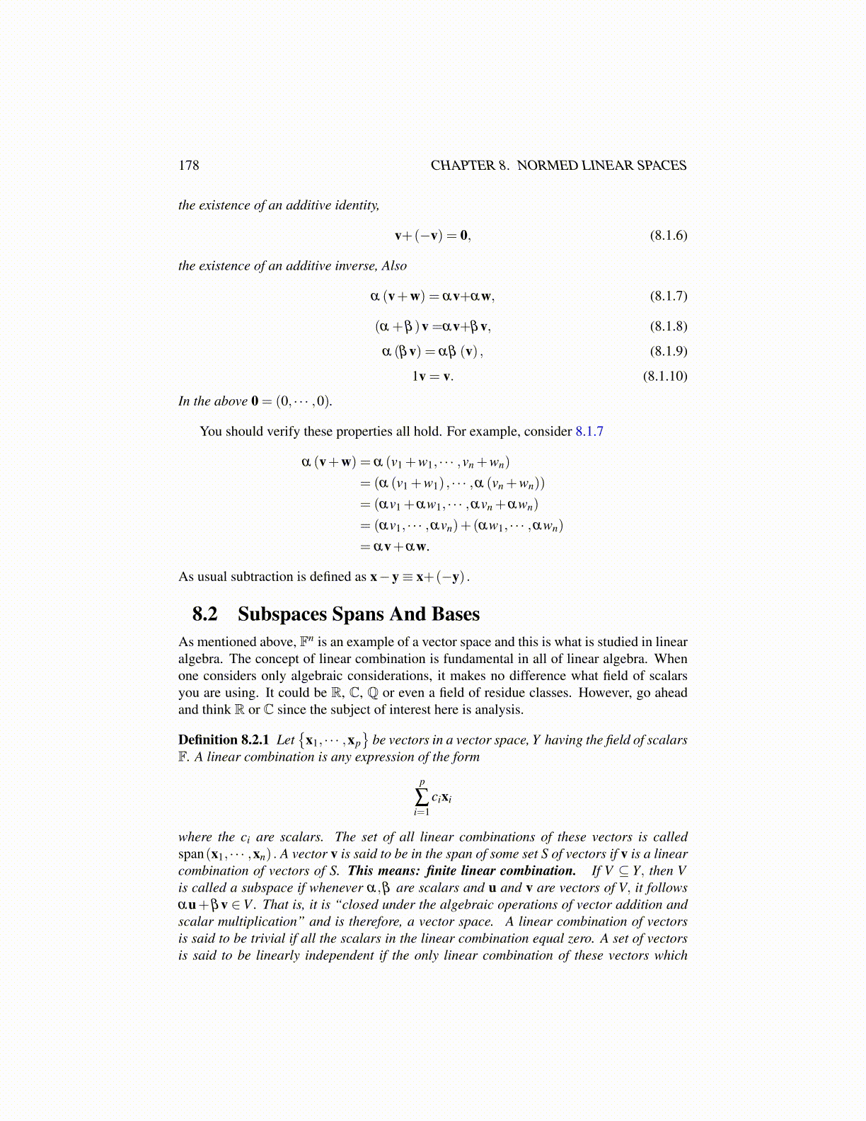 8.2 Subspaces Spans And BasesAs mentioned above, Fn is an example of a vector space and this is what is studied in linearalgebra. The concept of linear combination is fundamental in all of linear algebra. Whenone considers only algebraic considerations, it makes no difference what field of scalarsyou are using. It could be R, C, Q or even a field of residue classes. However, go aheadand think R or C since the subject of interest here is analysis.