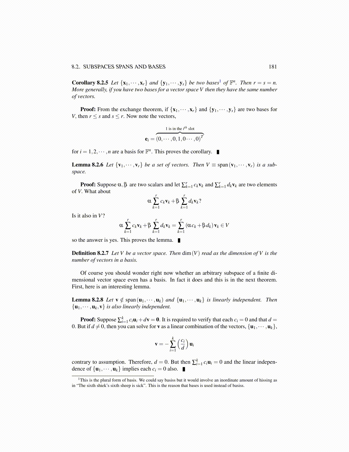 Corollary 8.2.5 Let {x1, · · · ,xr} and {y1, · · · ,ys} be two bases1 of Fn. Then r = s = n.More generally, if you have two bases for a vector space V then they have the same numberof vectors.