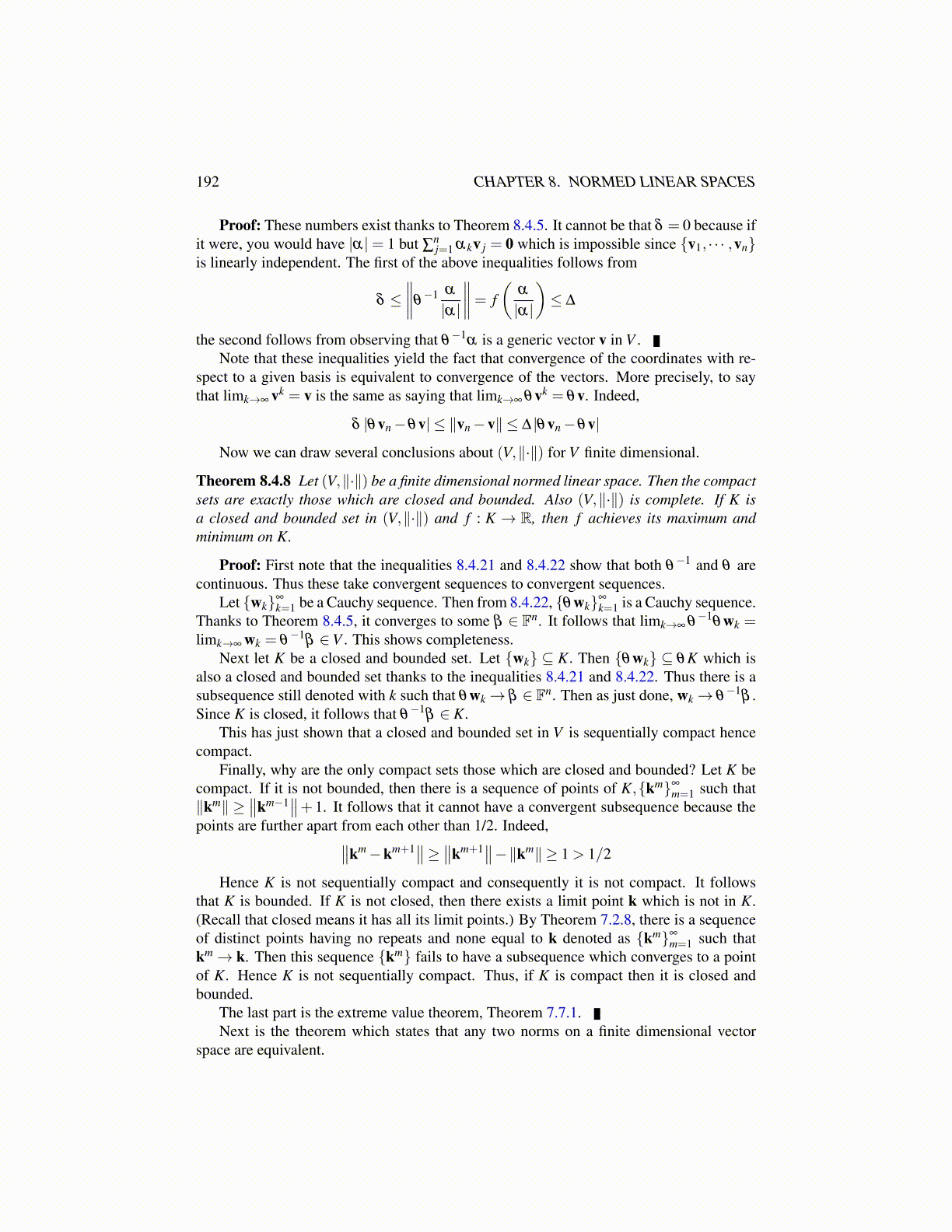 Theorem 8.4.8 Let (V,∥·∥) be a finite dimensional normed linear space. Then the compactsets are exactly those which are closed and bounded. Also (V,∥·∥) is complete. If K isa closed and bounded set in (V,∥·∥) and f : K → R, then f achieves its maximum andminimum on K.