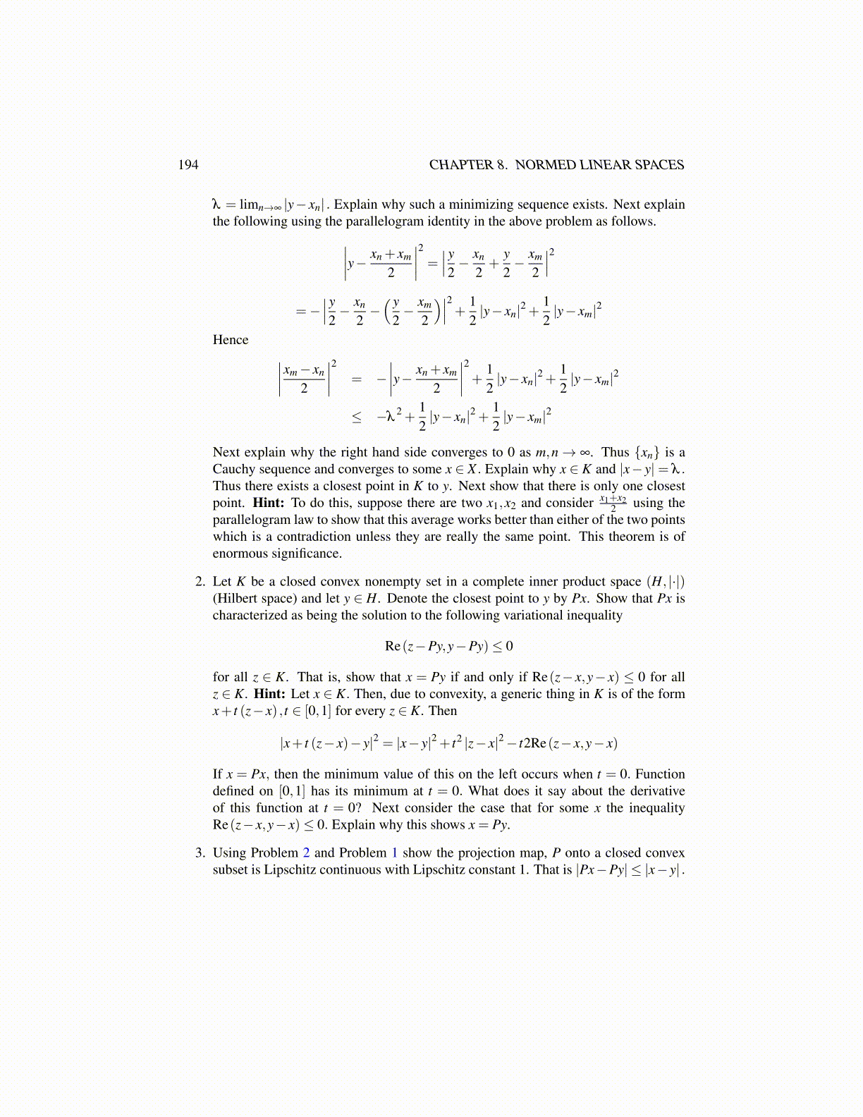Next explain why the right hand side converges to 0 as m,n→ ∞. Thus {xn} is aCauchy sequence and converges to some x ∈ X . Explain why x ∈ K and |x− y|= λ .Thus there exists a closest point in K to y. Next show that there is only one closestpoint. Hint: To do this, suppose there are two x1,x2 and consider x1+x2