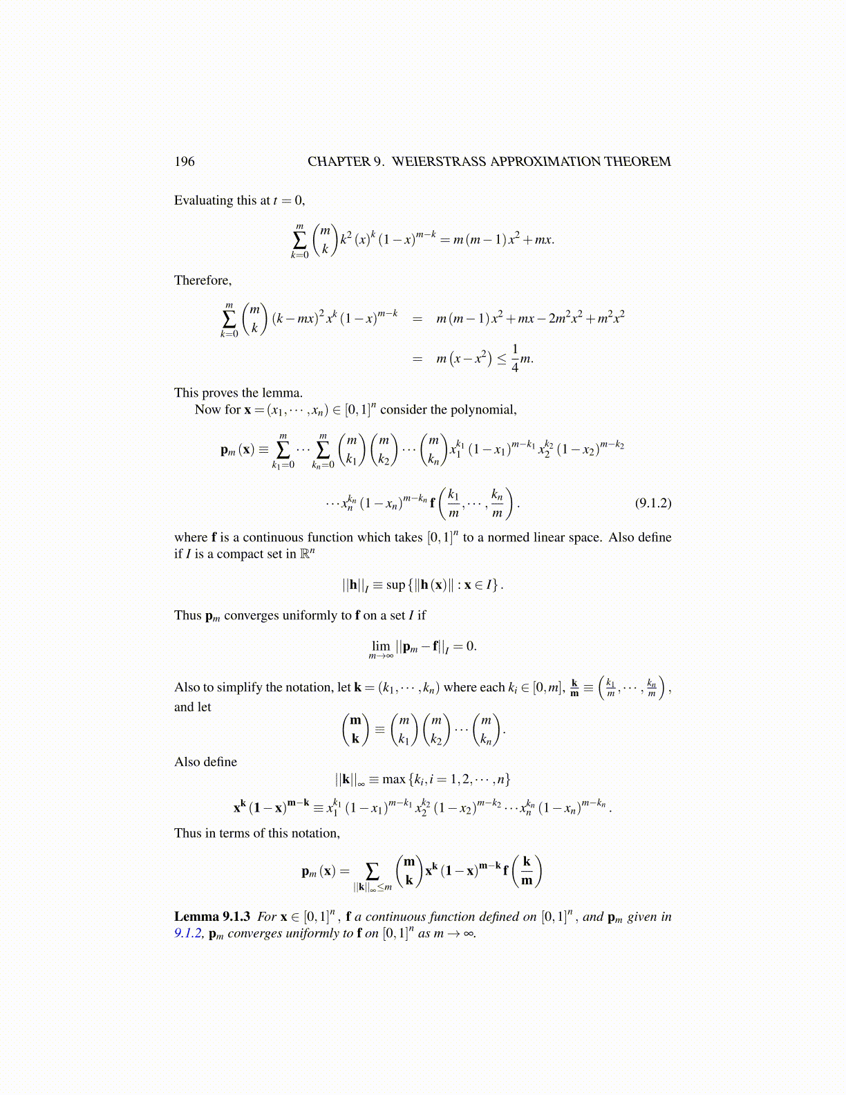 Lemma 9.1.3 For x ∈ [0,1]n , f a continuous function defined on [0,1]n , and pm given in9.1.2, pm converges uniformly to f on [0,1]n as m→ ∞.