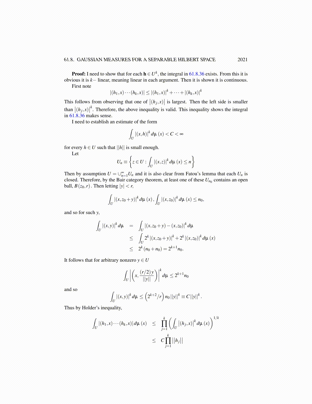 Definition 61.8.3 Let µ be a measure defined on B (X) , the Borel sets of X , a separableBanach space. It is called a Gaussian measure if each of the functions in the dual spaceX ′ is normally distributed. As a special case, when X =U a separable real Hilberts space,µ is called a Gaussian measure if for each v ∈ U, the function u→ (u,v)U is normallydistributed. That is, denoting this random variable as v′, it follows for A a Borel set in R
