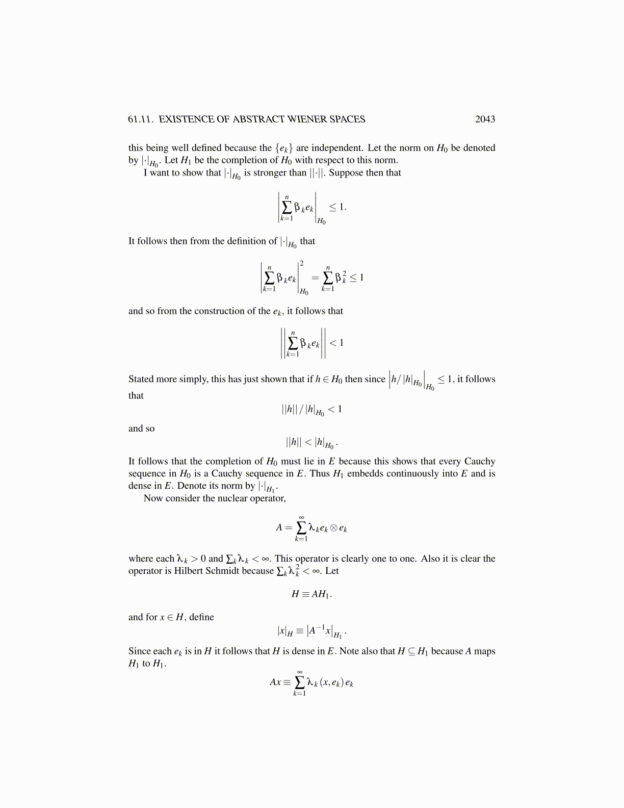 61.11 Existence Of Abstract Wiener SpacesIt turns out that if E is a separable Banach space, then it is the top third of an abstractWiener space. This is what will be shown in this section. Therefore, it follows from theabove that there exists a Gaussian measure on E which is the law of an a.e. convergentseries as discussed above. First recall Lemma 17.4.2 on Page 458.
