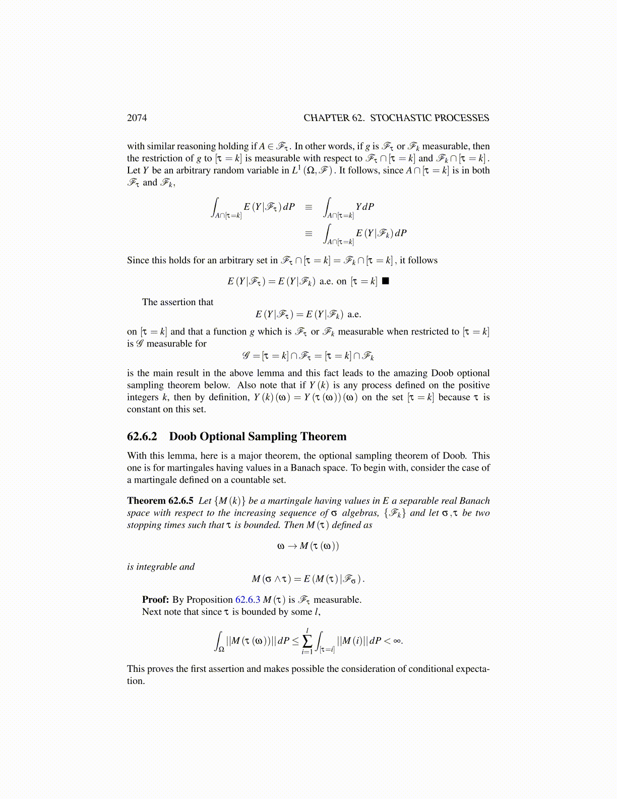 are equal. Letting G denote this σ algebra, if g is either Fτ or Fk measurable thenits restriction to [τ = k] is G measurable. Also if A ∈Fτ , and Y ∈ L1 (Ω;E) ,∫