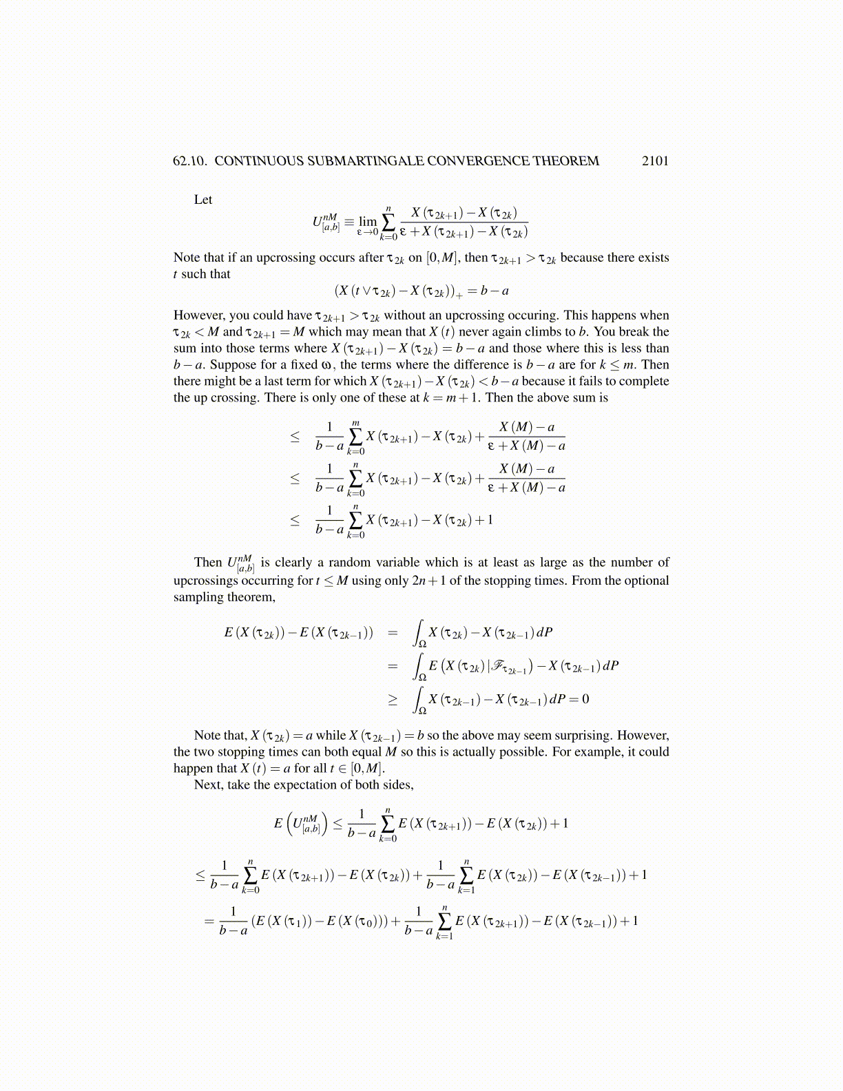 so X (0)≥ a. Then X is also a submartingale. It is an increasing convex function of one. IfY (t) has an upcrossing of [a,b] , then X (t) starts off at a and ends up at least as large as b.If X (t) has an upcrossing of [a,b] then it must start off at a since it cannot be smaller andit ends up at least as large as b. Thus we can count the upcrossings of Y (t) by consideringthe upcrossings of X (t).