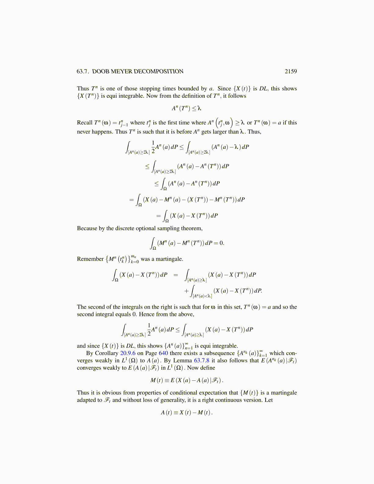 Theorem 63.7.12 Let {X (t)} be a submartingale of class DL. Then there exists a martin-gale, {M (t)} and an increasing submartingale, {A(t)} such that for each t,