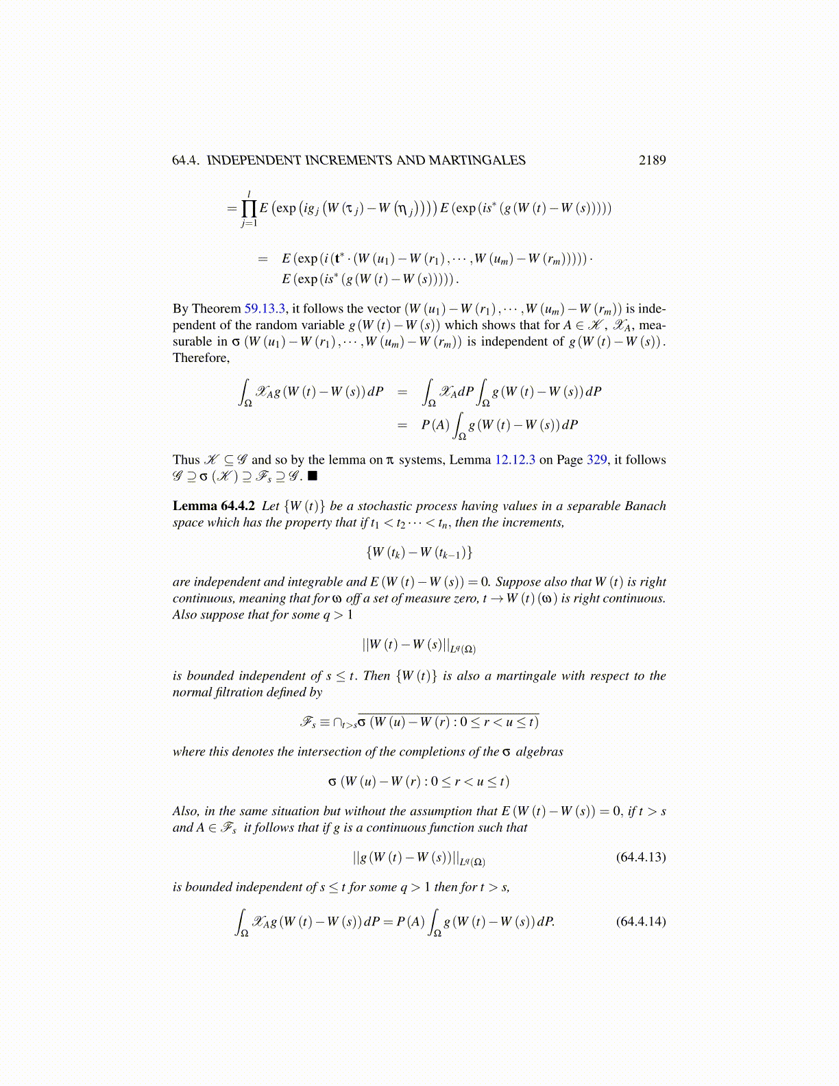 Theorem 64.3.4 Let E be a separable real Banach space. Then there exists a stochas-tic process, {W (t)} such that the distribution of W (t) and every increment, W (t)−W (s)is Gaussian. Furthermore, the increments corresponding to disjoint intervals are indepen-dent, L (W (t)−W (s)) =L (W (t− s)) =L