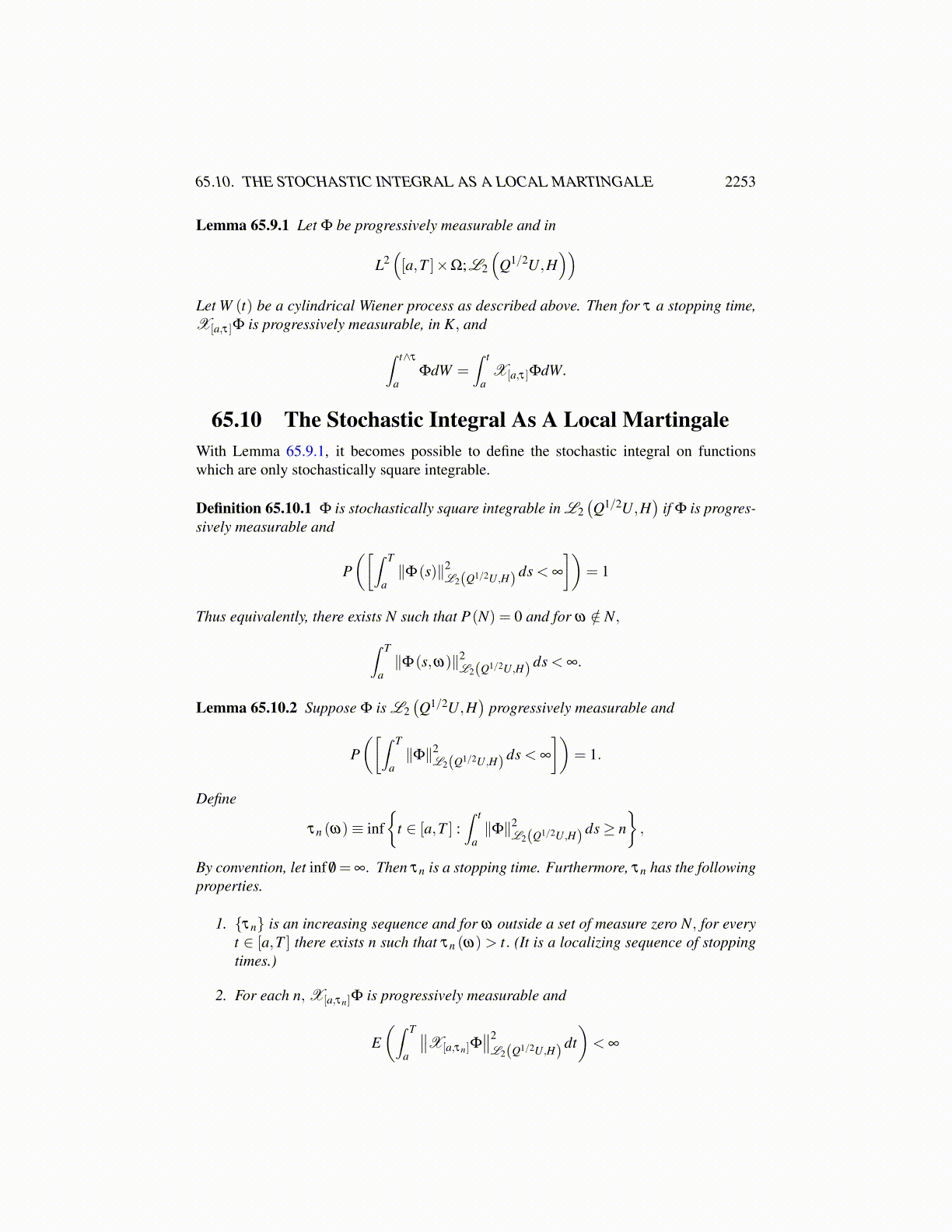The last step occurs because of the following reasoning. The kth term of the sum in themiddle expression above equals Φ(tk) if and only if t > tk and τ ≥ t. If the two conditionsdo not hold, then the kth term equals 0. As to the third line, if τ > tk and t ∈ (tk, tk+1], thenτ ≥ tk+1 ≥ t which is the same as the situation in the second line. The term equals Φ(tk).Note that X[τ>tk] (ω) is Ftk measurable, because [τ > tk] is the complement of [τ ≤ tk].Therefore, this is an elementary function. Thus, from 65.8.15 -65.8.16, X[a,τ] (t)Φ(t) is anelementary function and∫ t∧τ