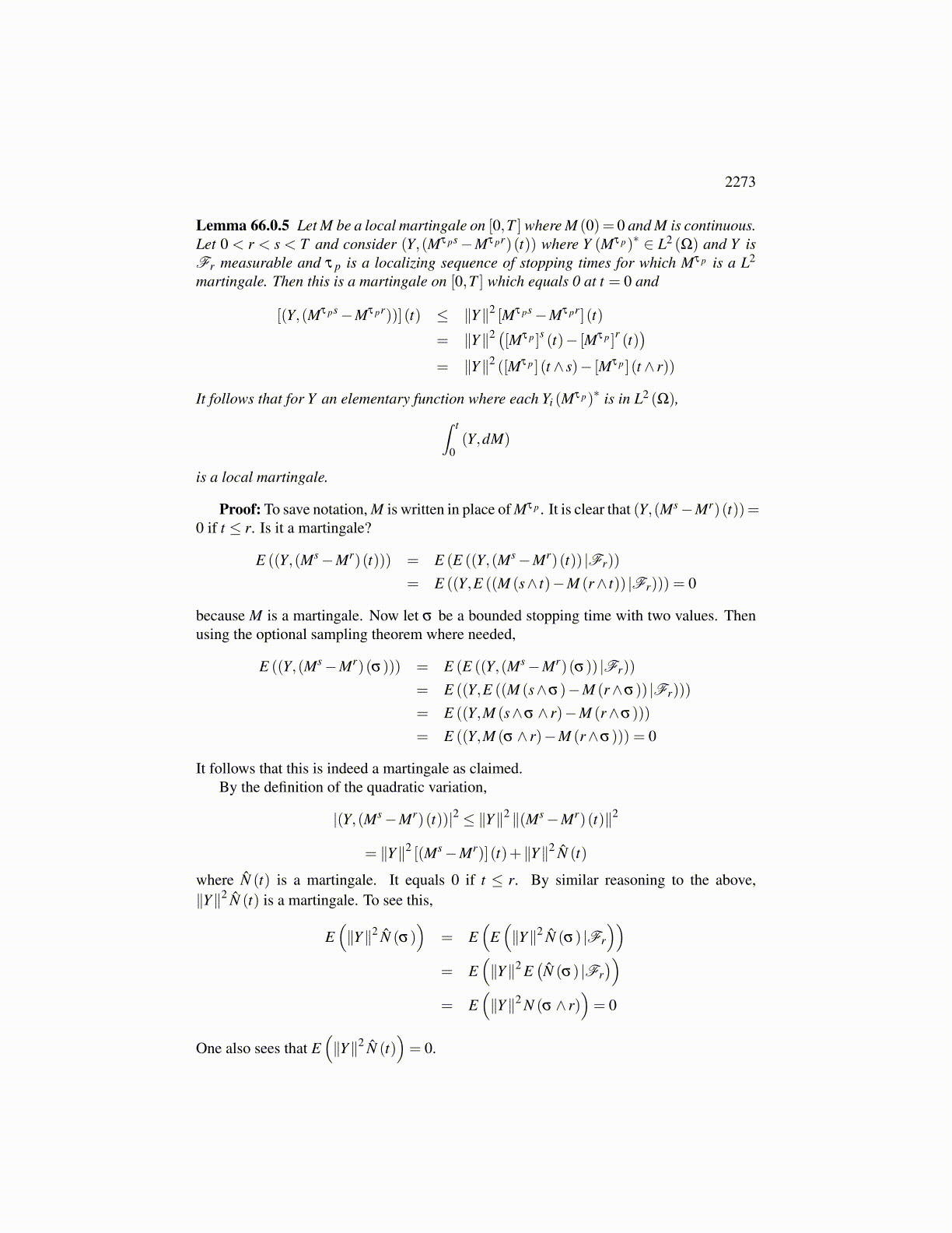 Assumption 66.0.3 We will always assume that d [M] is absolutely continuous with respectto Lebesgue measure. Thus d [M] = kdt where k ≥ 0 and is in L1 ([0,T ]×Ω). This is doneto avoid technical questions related to whether t→