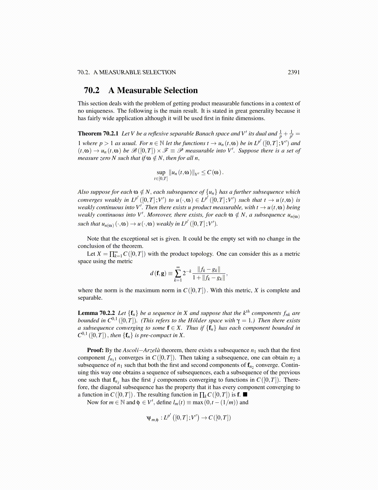 Measurability Without UniquenessWith the Ito formula which holds for a single space, it is time to consider stochastic ordinarydifferential equations. First is a general theory which allows one to consider measurablesolutions to stochastic equations in which there is no uniqueness available. Unfortunately, itdoes not include obtaining adapted solutions. Instead, it includes measurability of functionswith respect to a single σ algebra. Then when path uniqueness is available, one can includethe concept of adapted solutions rather easily and this will be done for ordinary differentialequations. First is a general result about multifunctions.
