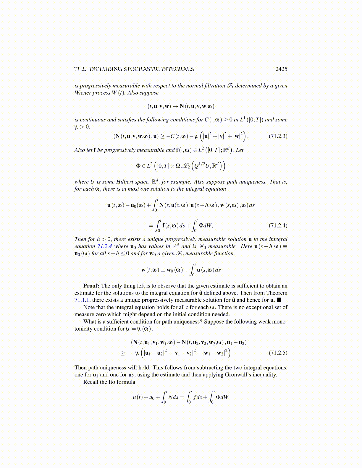 where w0 is a given F0 measurable function. Also assume that for each ω there is at mostone solution to the integral equation 71.1.2. Then for h > 0, there exists a progressivelymeasurable solution u to the integral equation 71.1.2.