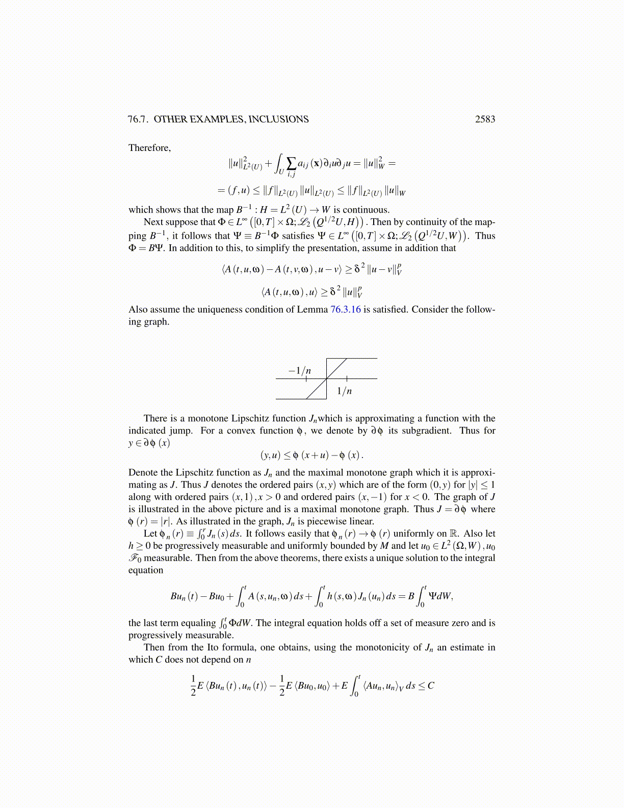 The nonlinear operator is obviously monotone and hemicontinuous. As for u0, it is onlynecessary to assume u0 ∈ L2 (Ω,W ) and F0 measurable. Then Theorem 76.4.7 gives theexistence of a solution in the sense that for a.e. ω the integral equation holds for all t. Notethat b can be unbounded and may also vanish. Thus the equation can degenerate to the caseof a non stochastic nonlinear elliptic equation.
