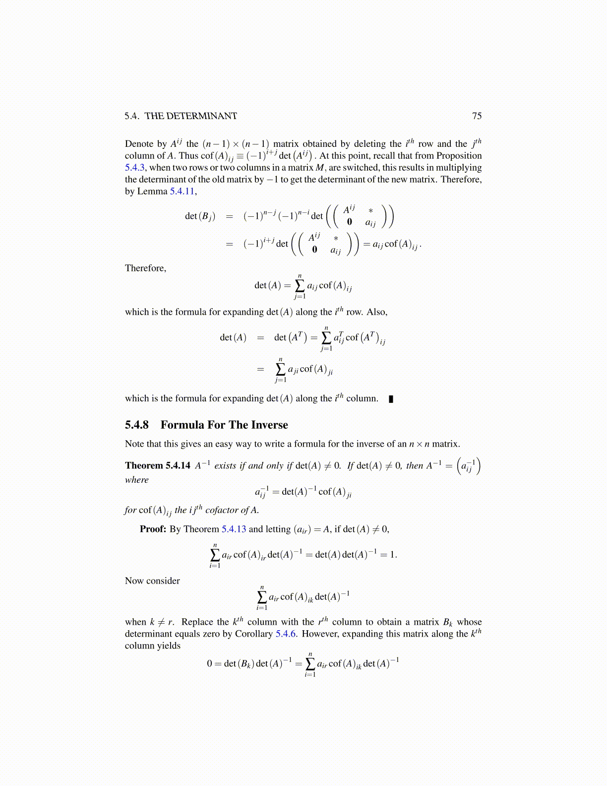 Theorem 5.4.14 A−1 exists if and only if det(A) ̸= 0. If det(A) ̸= 0, then A−1 =(