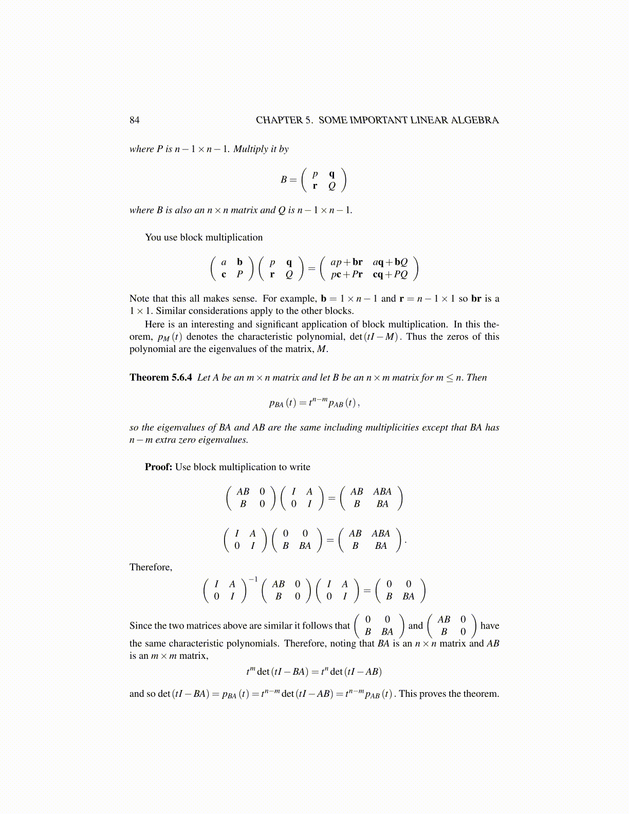 and so det(tI−BA) = pBA (t) = tn−m det(tI−AB) = tn−m pAB (t) . This proves the theorem.