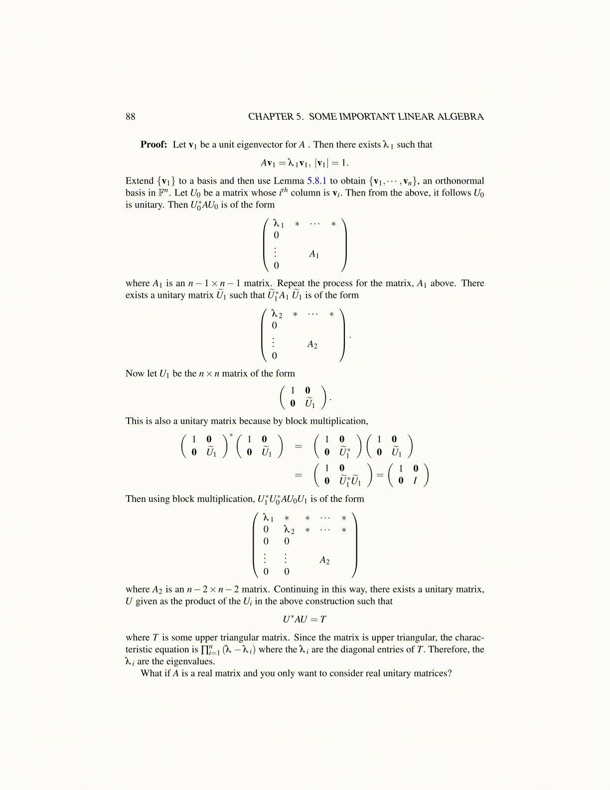 Extend {v1} to a basis and then use Lemma 5.8.1 to obtain {v1, · · · ,vn}, an orthonormalbasis in Fn. Let U0 be a matrix whose ith column is vi. Then from the above, it follows U0is unitary. Then U∗0 AU0 is of the form