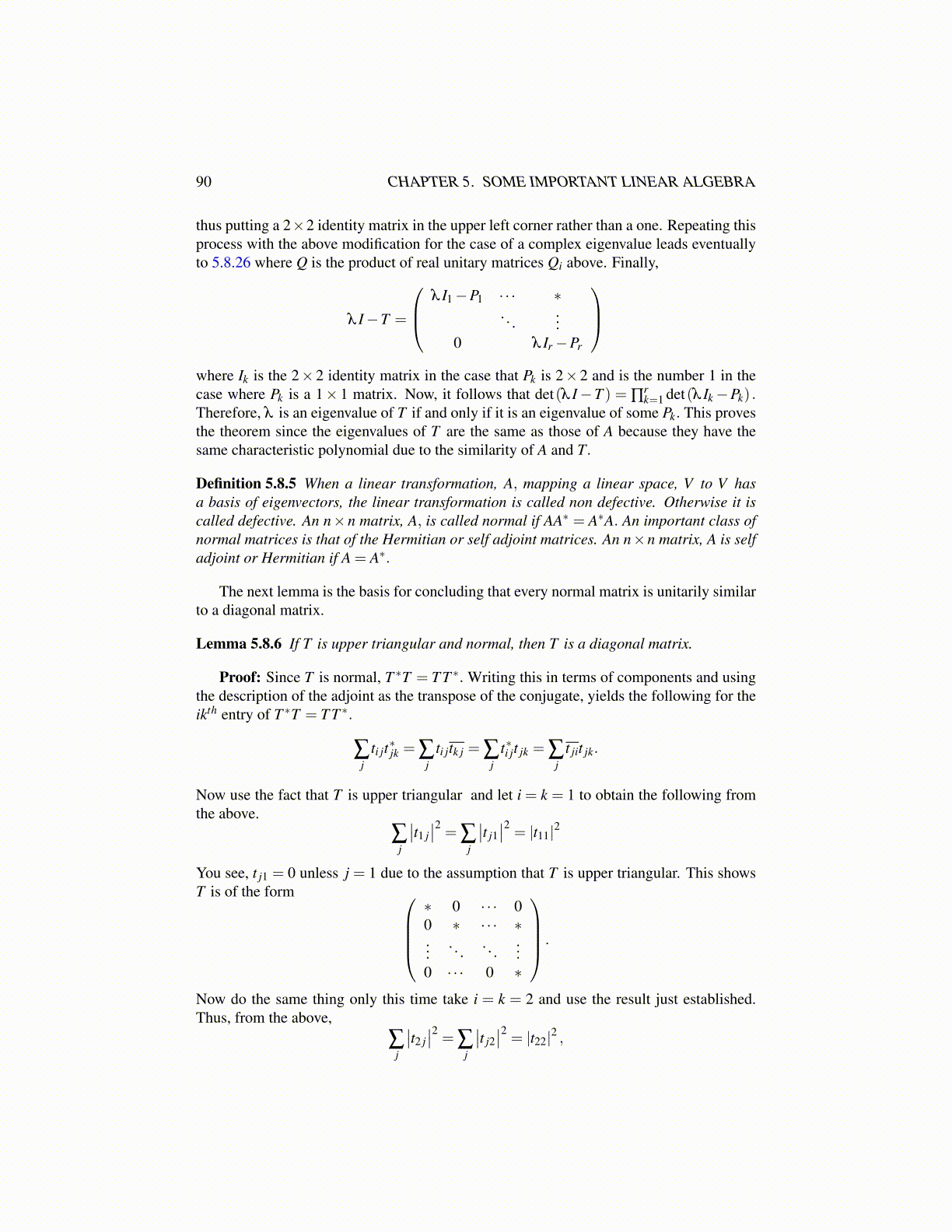 Definition 5.8.5 When a linear transformation, A, mapping a linear space, V to V hasa basis of eigenvectors, the linear transformation is called non defective. Otherwise it iscalled defective. An n×n matrix, A, is called normal if AA∗ = A∗A. An important class ofnormal matrices is that of the Hermitian or self adjoint matrices. An n×n matrix, A is selfadjoint or Hermitian if A = A∗.