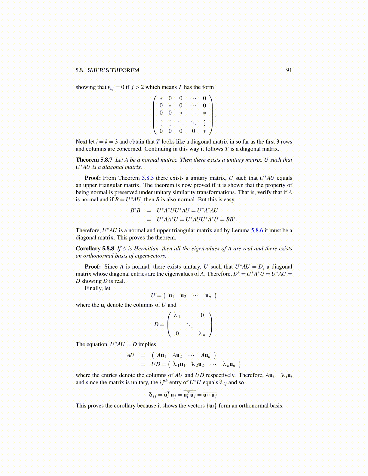Proof: From Theorem 5.8.3 there exists a unitary matrix, U such that U∗AU equalsan upper triangular matrix. The theorem is now proved if it is shown that the property ofbeing normal is preserved under unitary similarity transformations. That is, verify that if Ais normal and if B =U∗AU, then B is also normal. But this is easy.